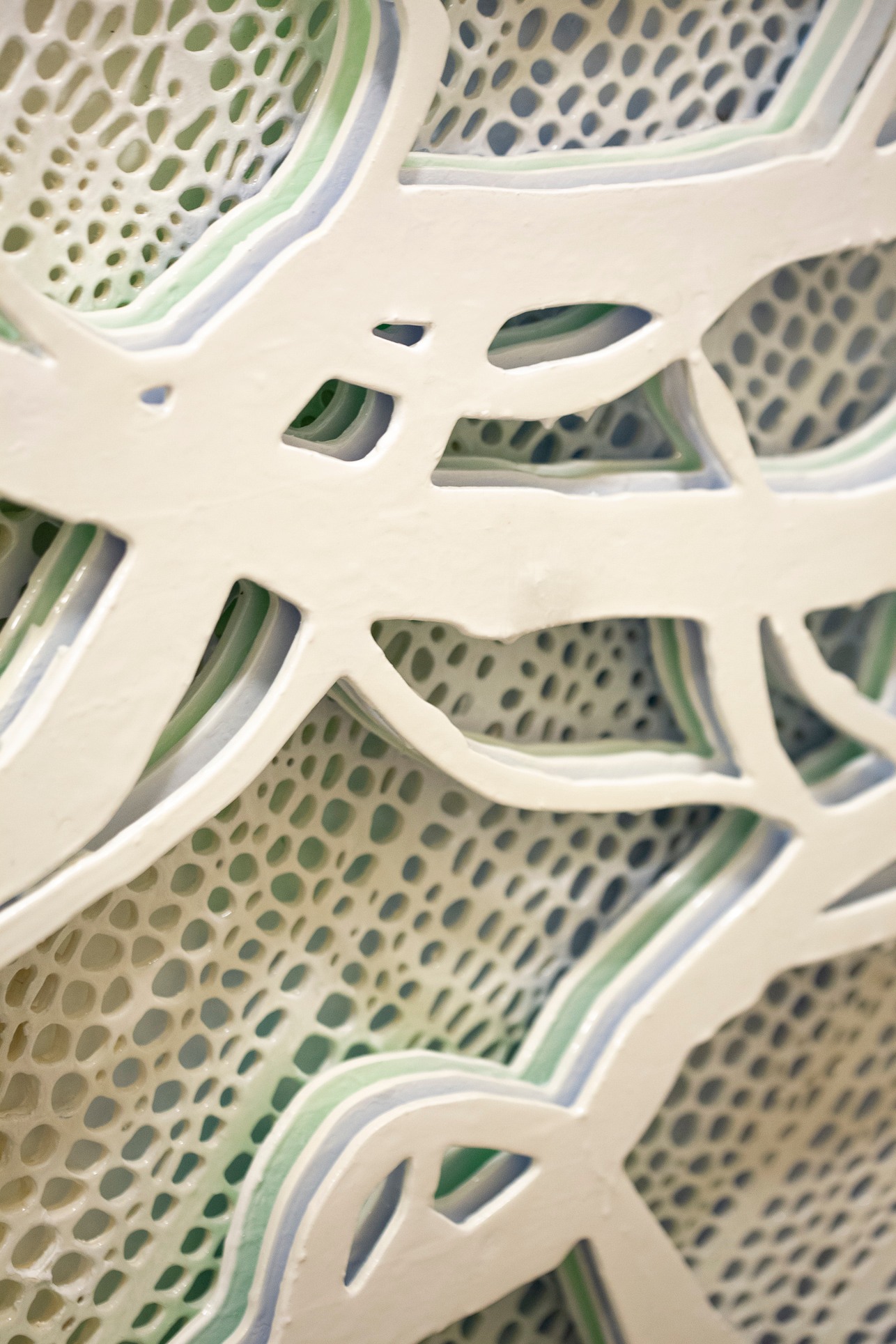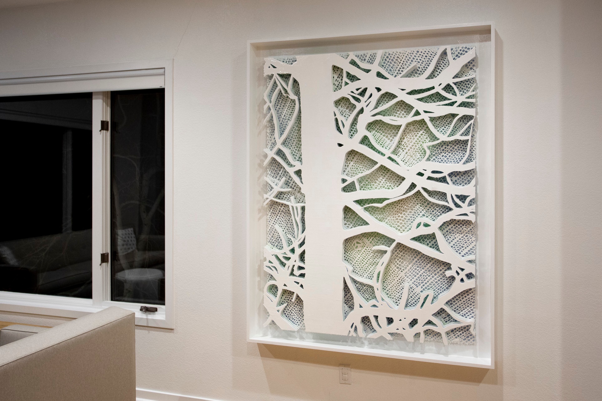 This is a bas-relief sculpture of the patterns of branches and cell structures of the trees created by layering cut and painted wood panels. The front-facing planes are white. The color in the art is experienced as reflected color on the white surfaces. The patterned bottom layer of the artwork is taken from the wood anatomy of Whitebark pine. Alan Crivellaro prepared the anatomy section and imaged the slide. The composition of the top layers is based on the tangled lower branch structure of a specific Whitebark pine tree growing on an exposed ridge on Paulina Peak in Newberry Volcanic Monument near Bend, Oregon.