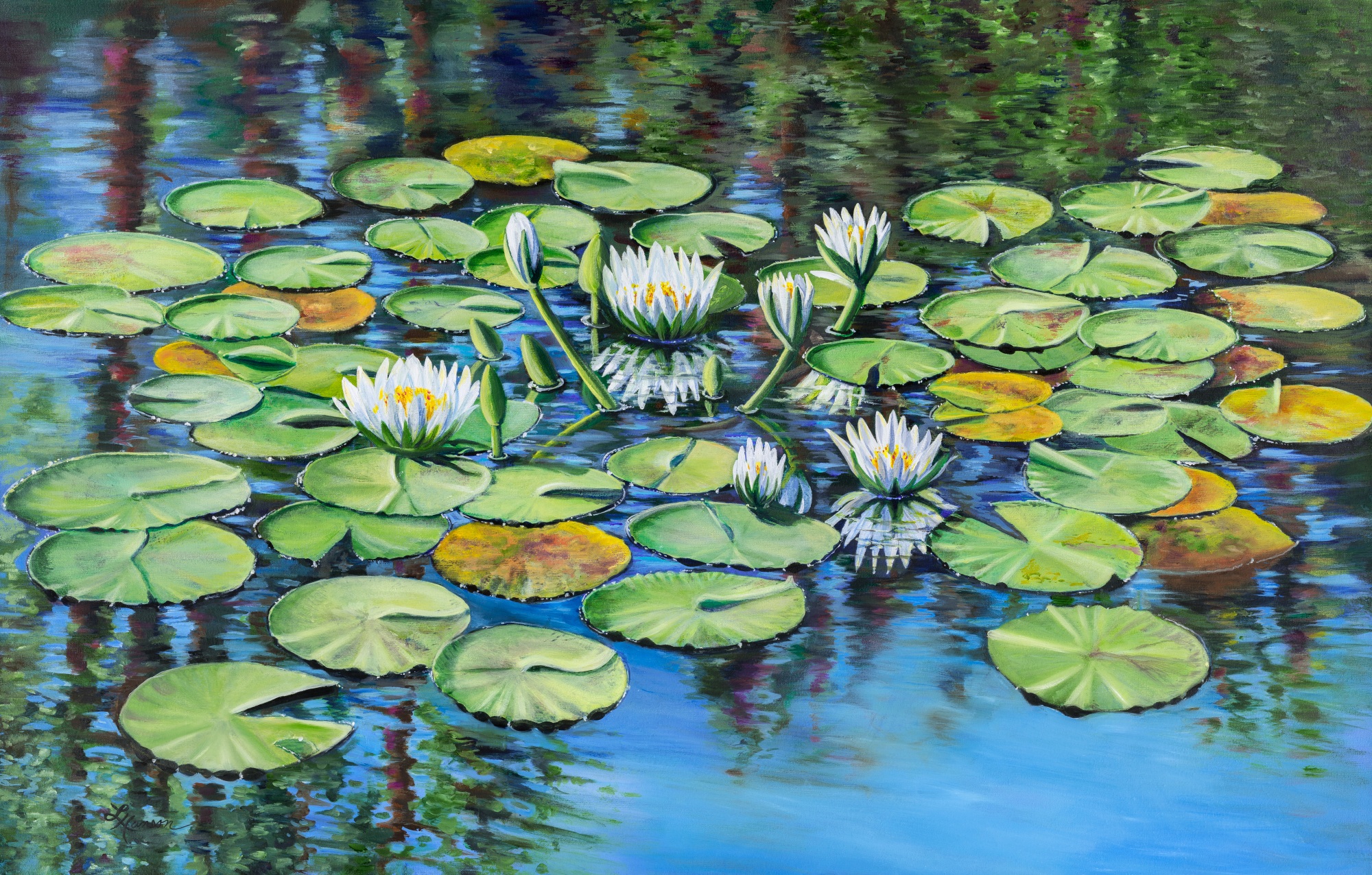 Waterlilies are one of my favorite subjects to paint! The flowers and lily pads with the water has calming effect. The light blue of the water reflects the morning's light with the lilies just opening. I want the delicate ripples of the tree reflections in the water to be as exciting to the viewer as looking at the lily pads resting on top of the pond.