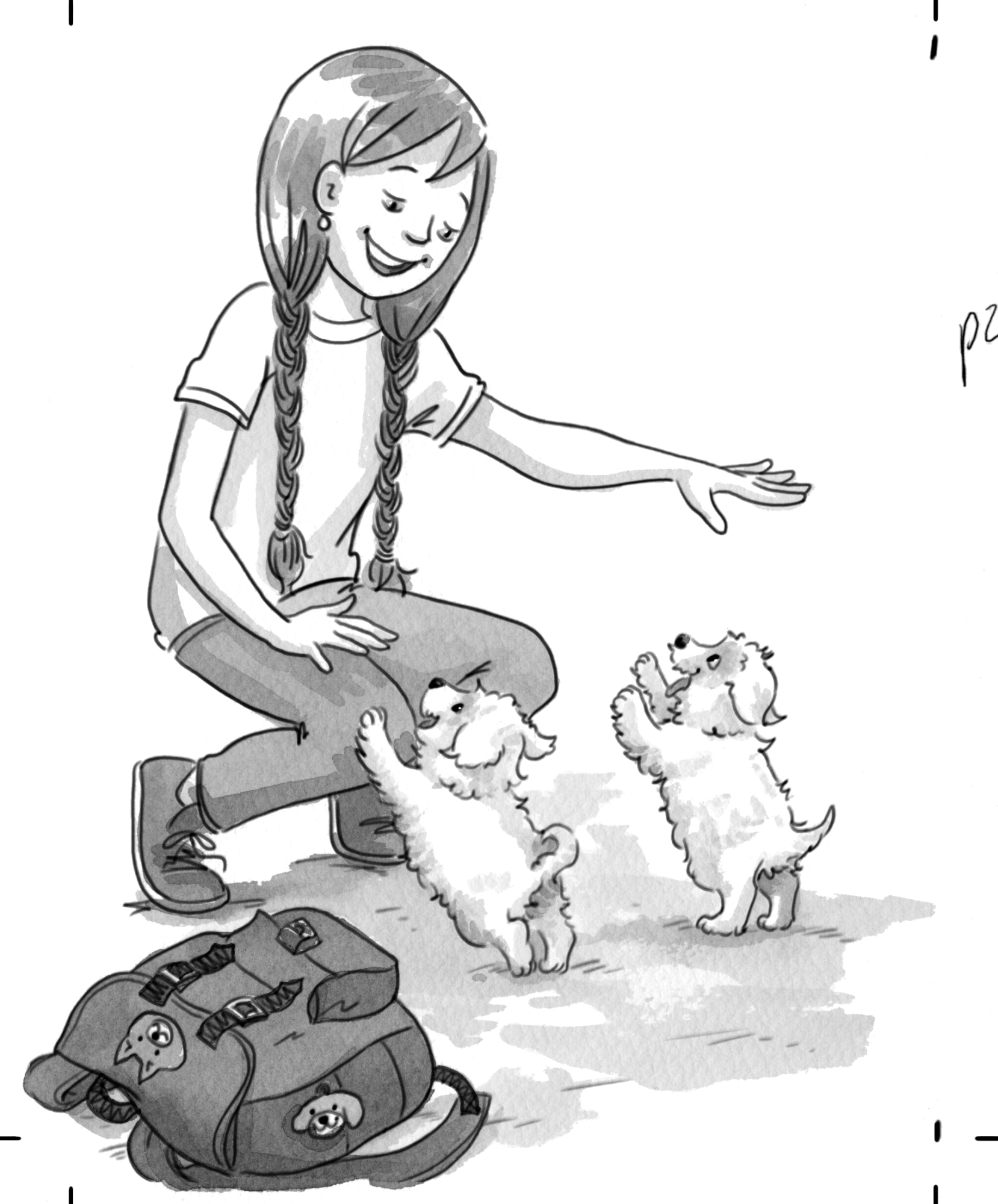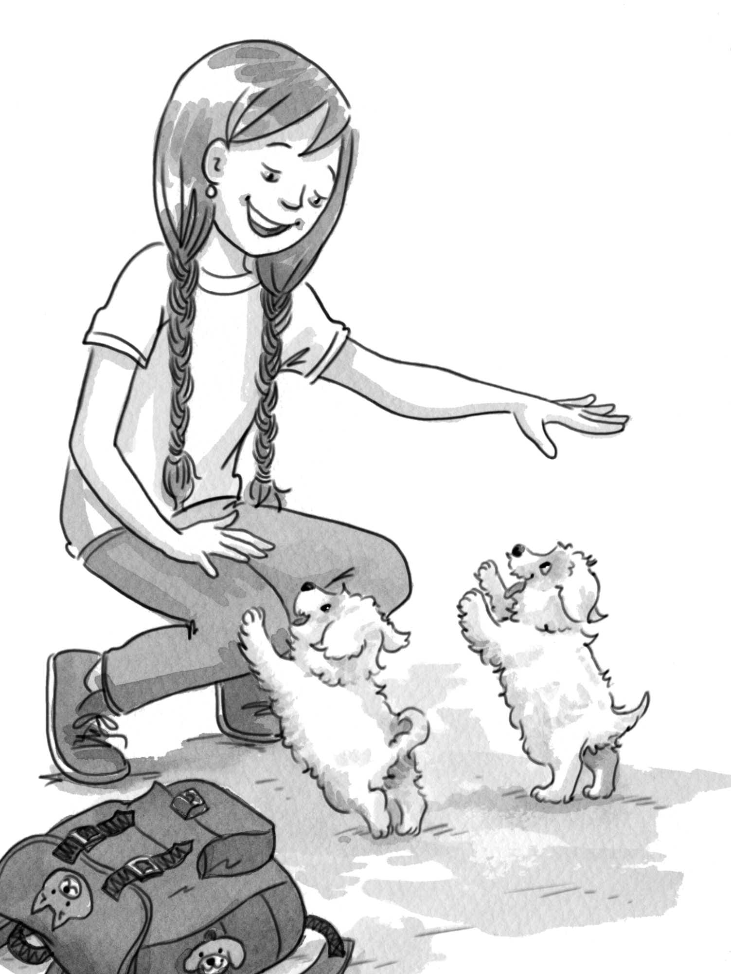 Illustration from the children's chapterbook "Bijou Needs a Home" in English, "Bijou cherche une maison" in French, ©2014 Sylvie Brien, Scholastic Canada, India ink washes over archival printer ink on acid-free cotton paper. Pages 28-29