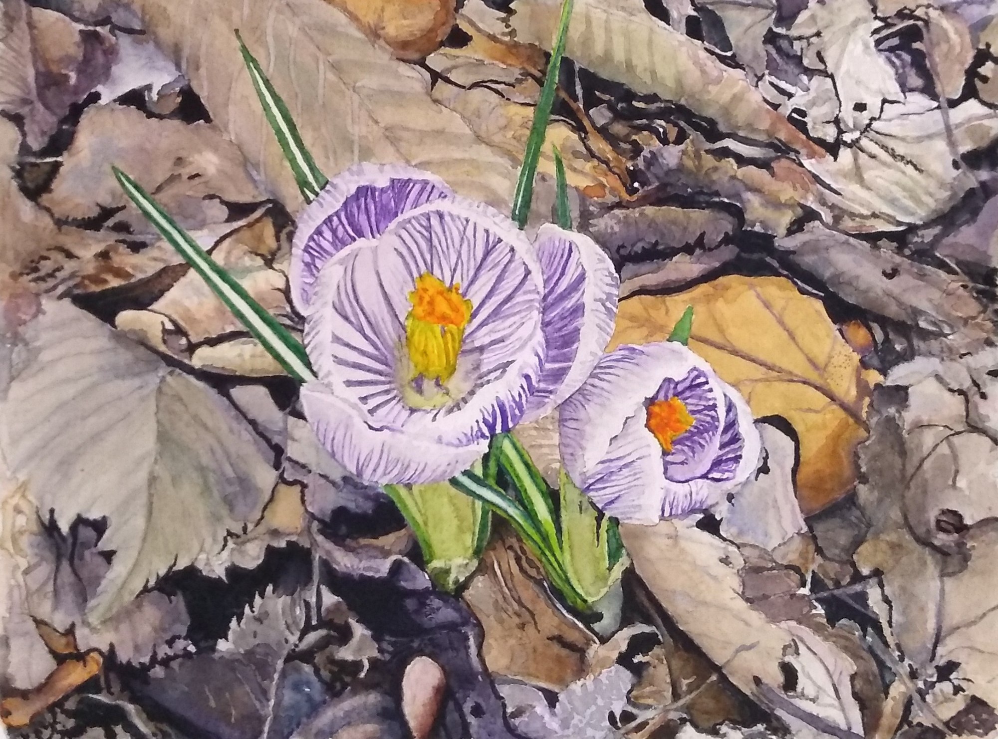 One of the first signs of spring in southern Indiana is the crocus poking up through the leaves. Unframed.