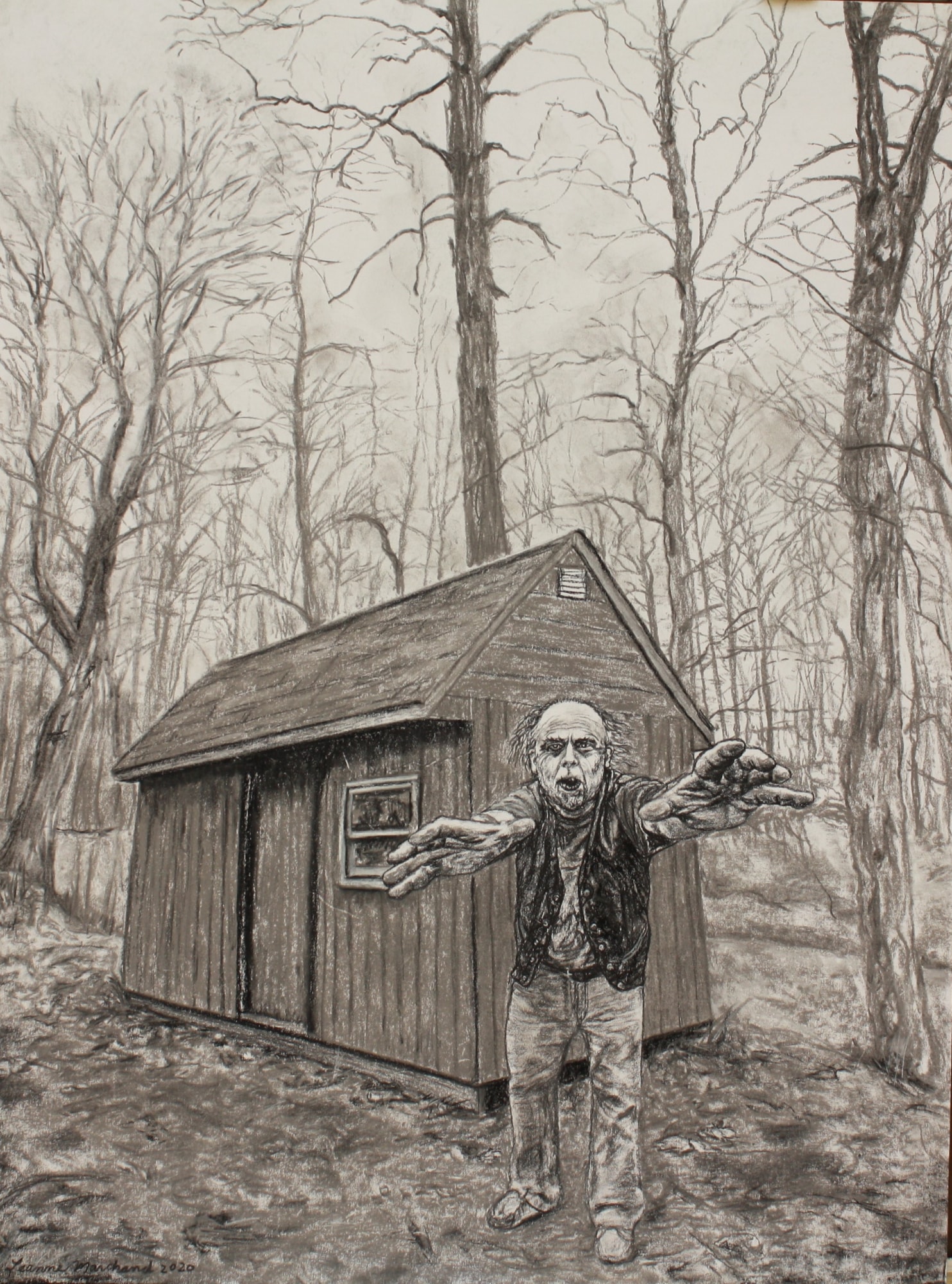 The Shed is a drawing of my own shed that represents how I was feeling about Covid-19 in early 2020, like something threatening was coming for us all, making even familiar places scary. Professionally matted and framed with black wood frame and museum glass.