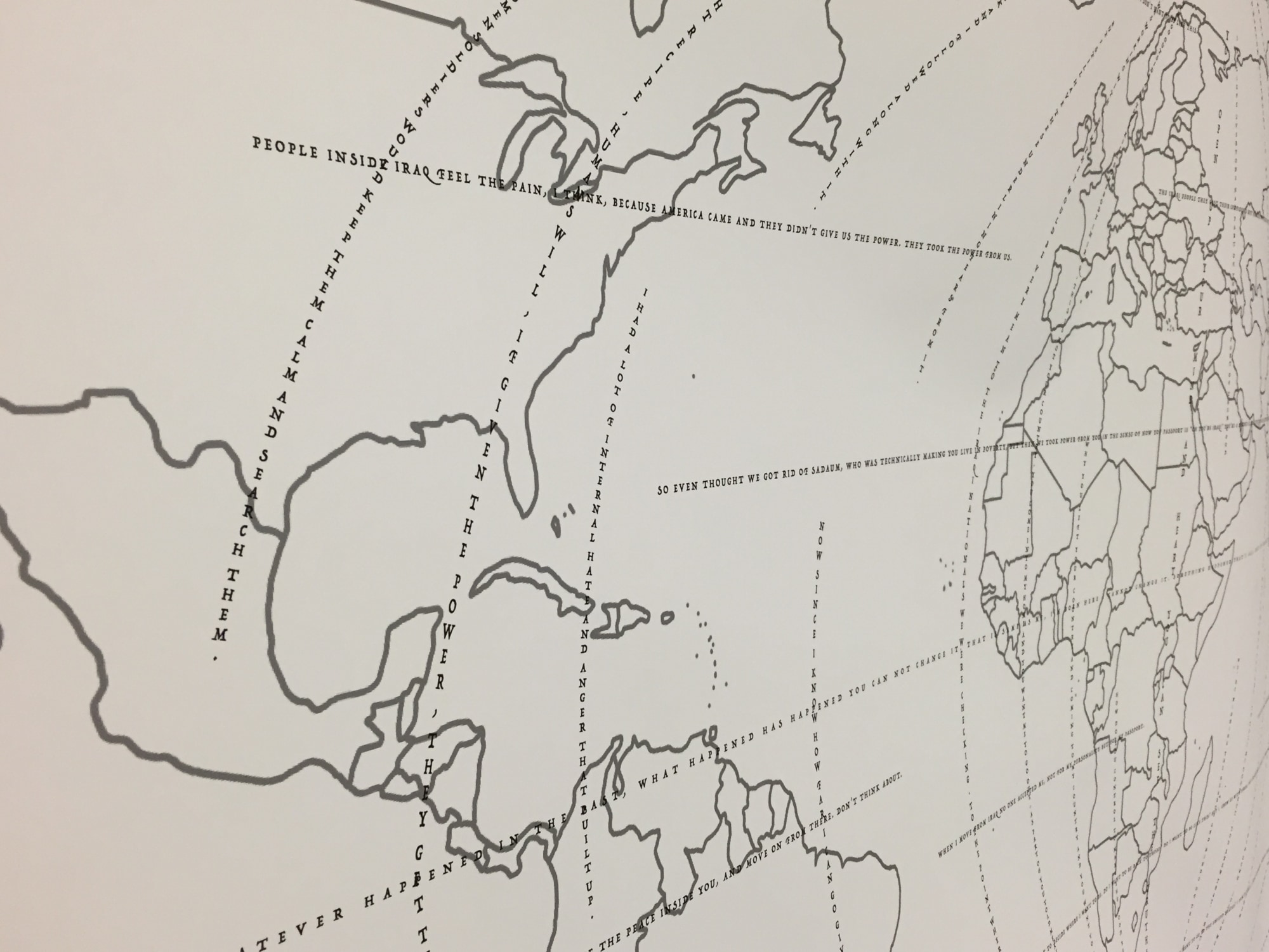 "When you open up your mind and heart you can see the truths of the world." The center phrase on the latitude line of the map sums up how we as a world can be a kinder and understanding society. This work is a series of quotes from a conversation of an Iraqi war veteran and Iraqi refugee displaced from the war in his home land. The conversation is about how each approached and survived the atrocities of the war and how the true issue is that society judges people not only by the color of their skin but by the passport they hold verse the heart and intent of the person holding it.