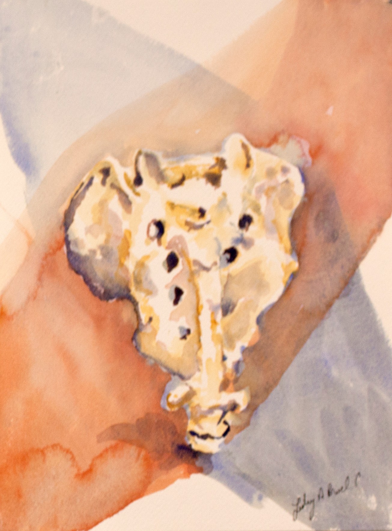 "Portrait of a Sacrum" is a captivating watercolor painting inspired by the artist's movement mentor, Marie-Jose Blum. The artwork features vibrant color crosses that animate the sacrum, showcasing a unique perspective on the complexity of the human body. Part of the Anatomy Dances series, this piece is a visual representation of the artist's exploration of anatomy through art. The use of watercolor creates a soft and ethereal quality to the painting, enhancing the beauty and fluidity of the subject matter.