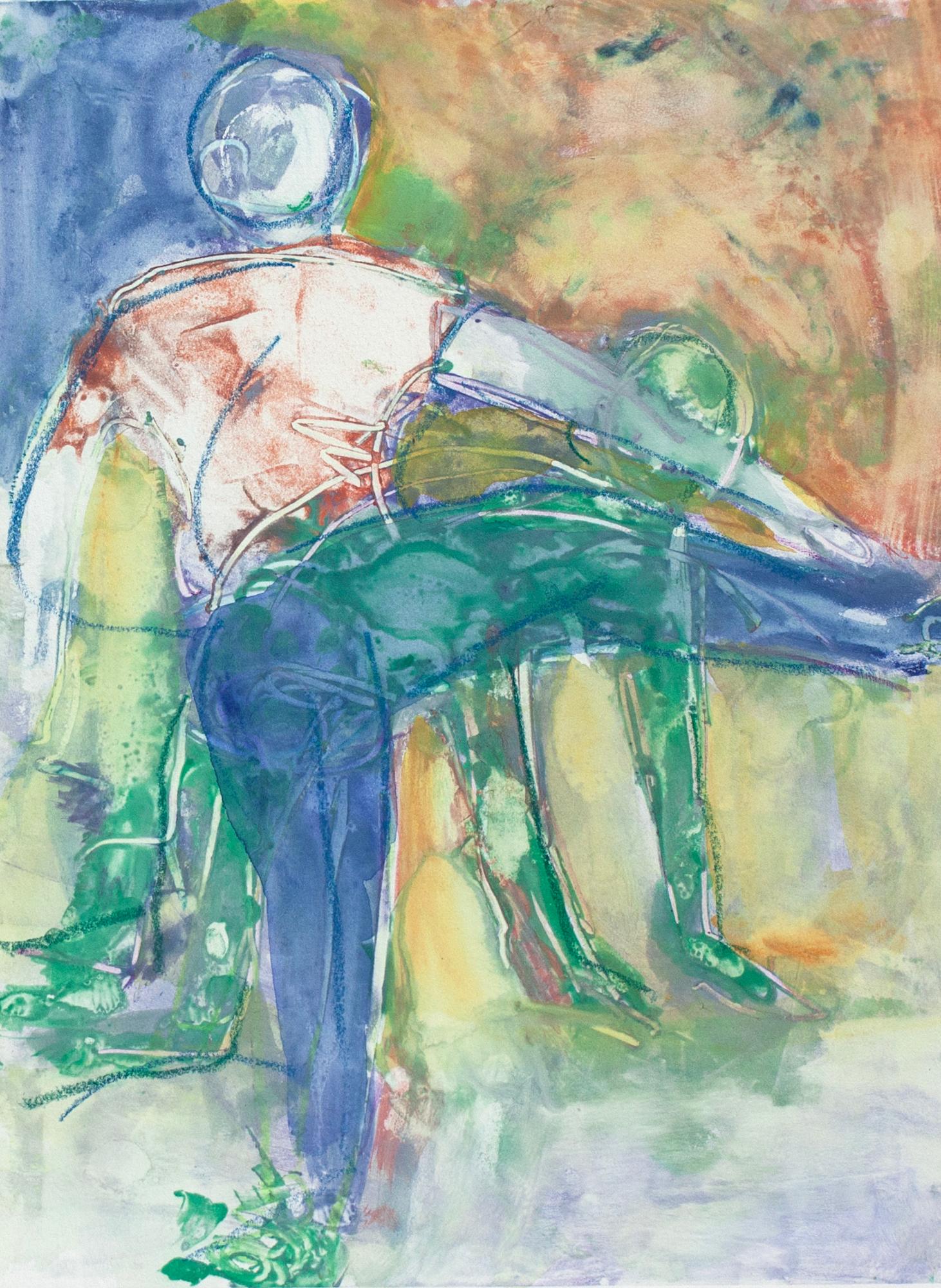 This monotype was done at a workshop with Lisa Macke. I was working from a drawing that I did with live models. I continue working with gouache to this piece.
