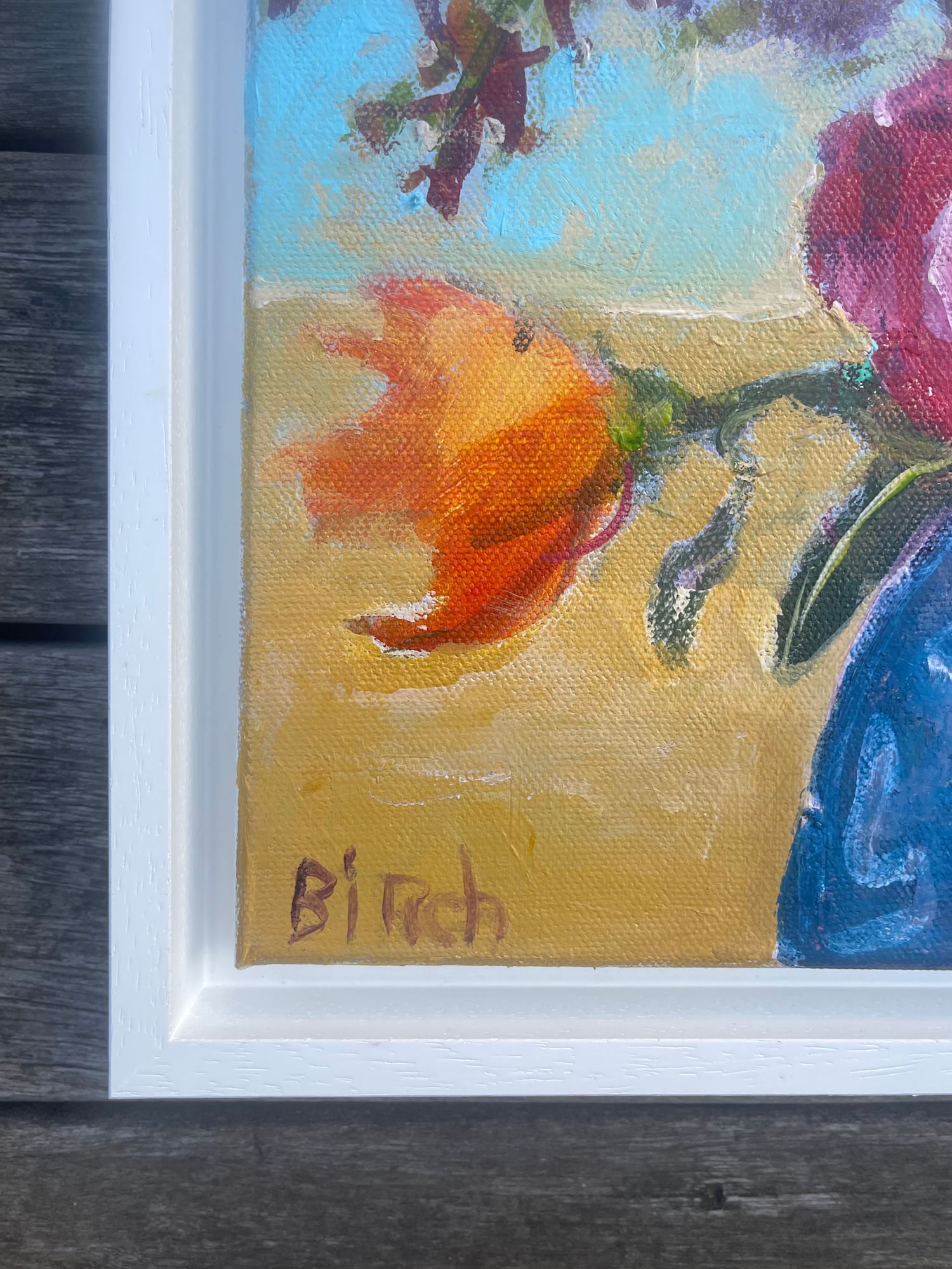 Peachy roses with a purple hydrangea - colour uplift. White Float Frame Overall size 34 x 34 cms
