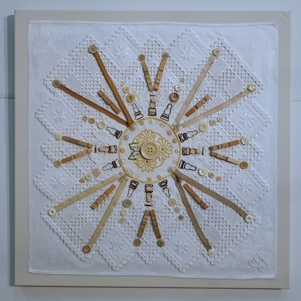 Lesley Turner, 'Laundry Mantra: Mind the Haberdashery', 2021, 26" x 26". Vintage cotton domestic linens, zippers, buttons, metal hooks, metal clothes pegs, polyester thread. This mantra inspires mindfulness in preserving delicate life connections, symbolized by a launderer's attention to haberdashery details.