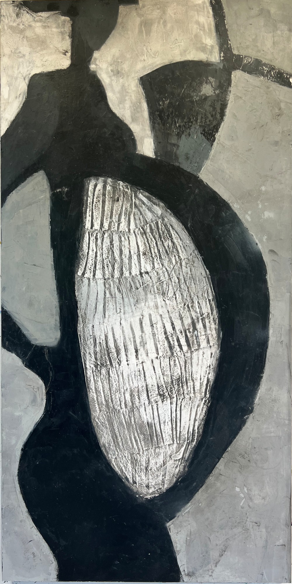 Miraculous this painting started as a cursive f touching three sides of the panel, quickly I saw a young woman pregnant with her first child and all the magical, miraculous thoughts and feeling she must be amazed by.