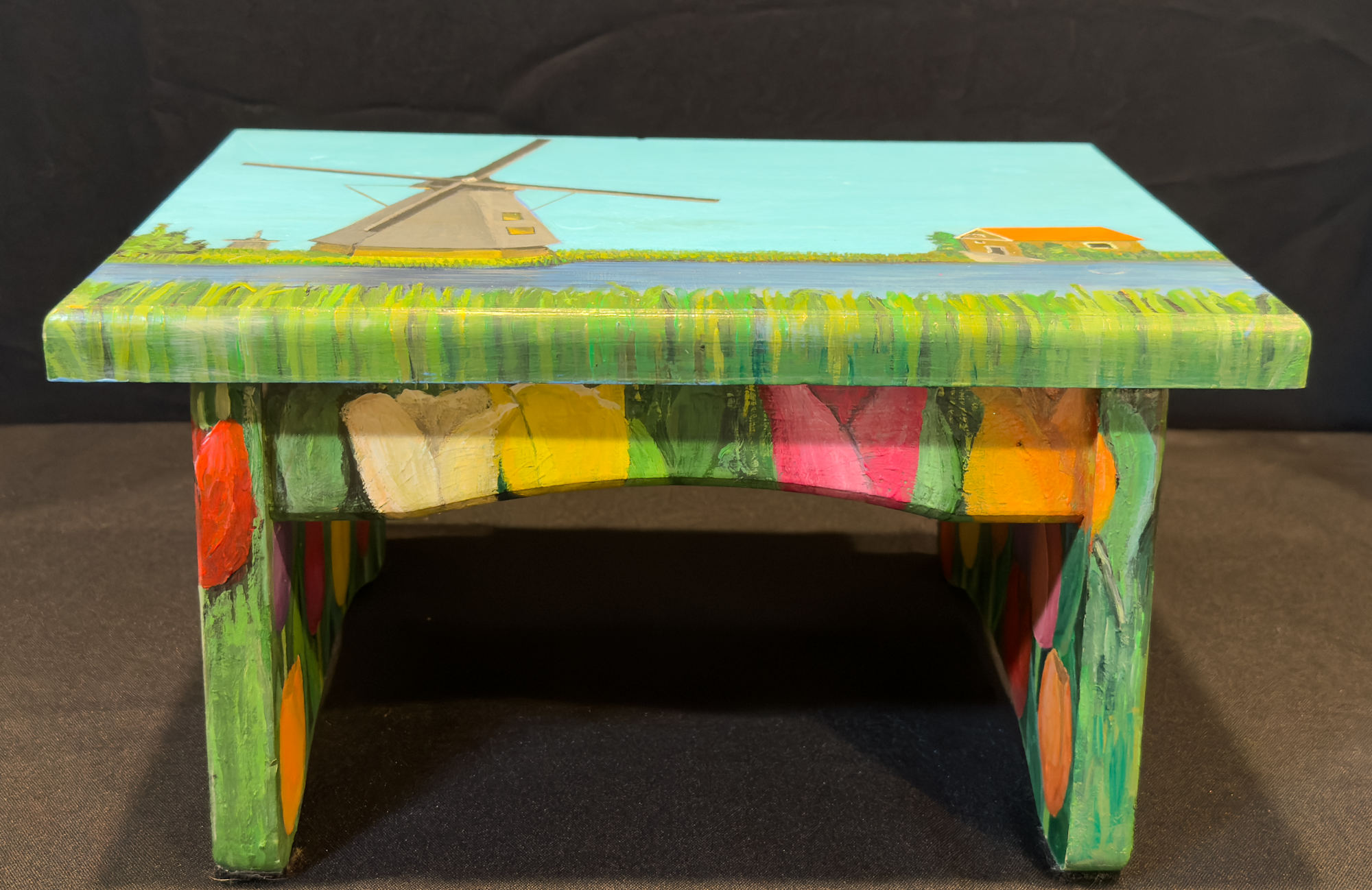 Rectangle stool, windmill and tulips.
