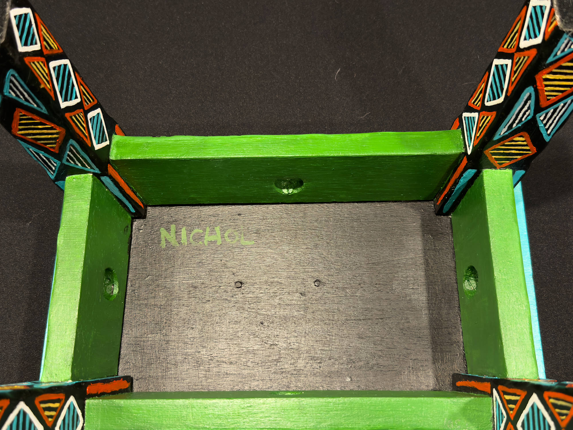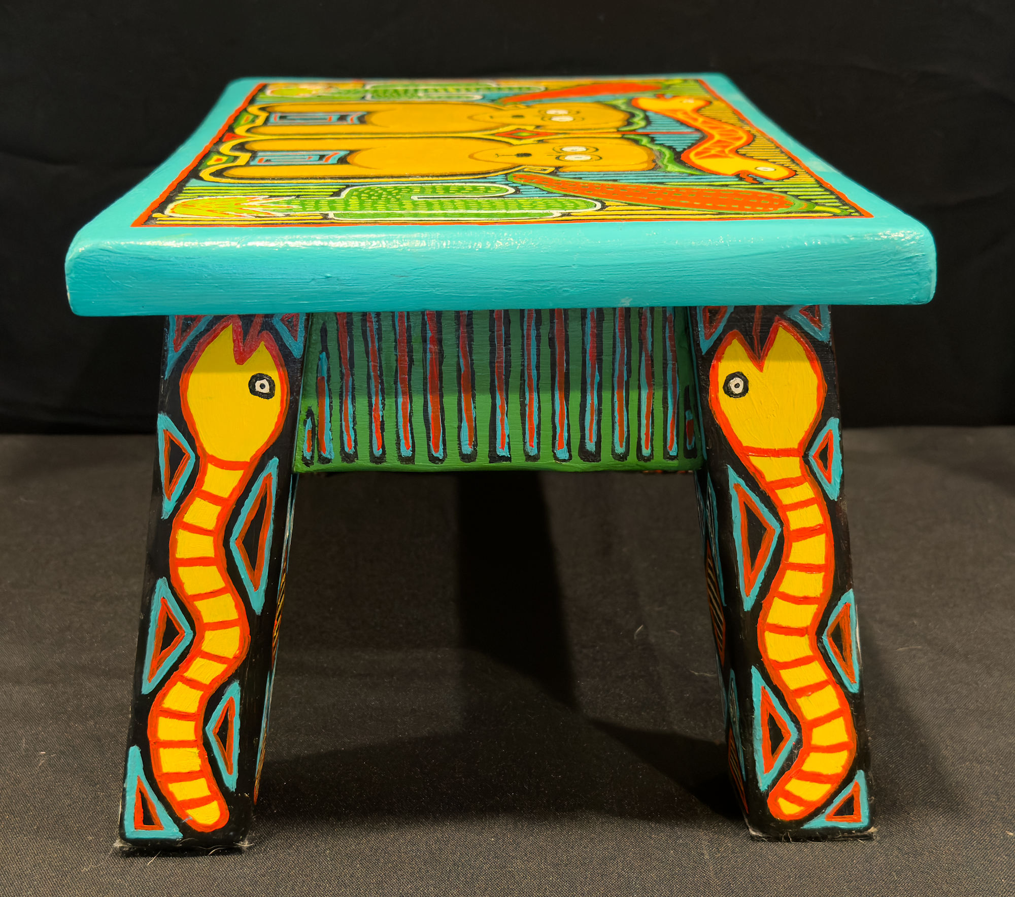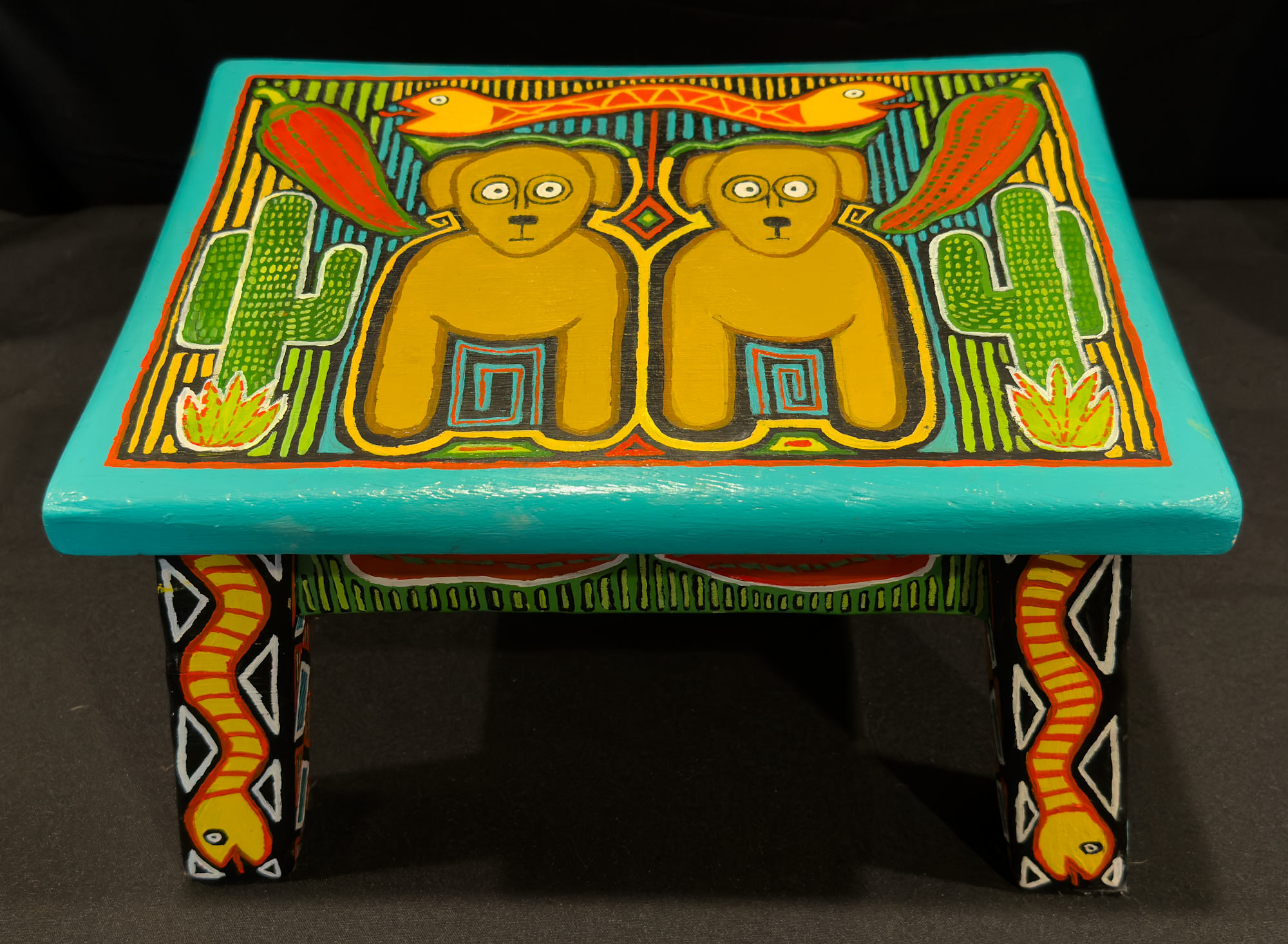 Stool has two dogs, two red peppers, snake and cactus on surface.