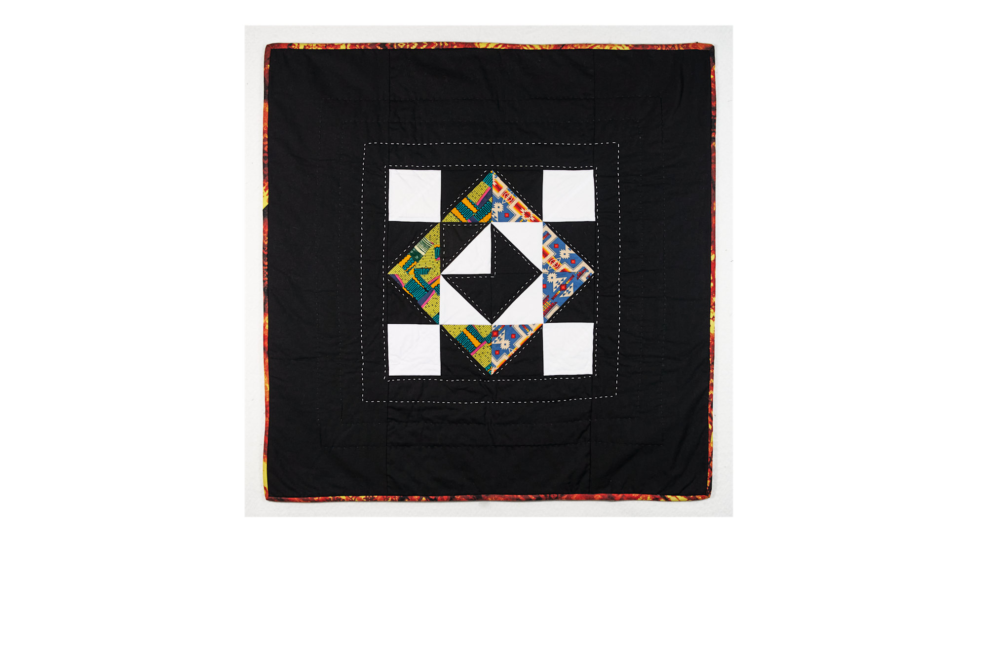 As best as I could, I expressed in this design that truth. [Surrounding a symbolic envelope,] pieces of textiles from Native American and African American cultures serve as petals. Much like a petal that falls off of a flower, each one can be quite beautiful on its own, representing part of, but not the whole, flower. This is where I sit with my family history: incomplete truth - some light, some dark - the flower of our history reduced to petals.