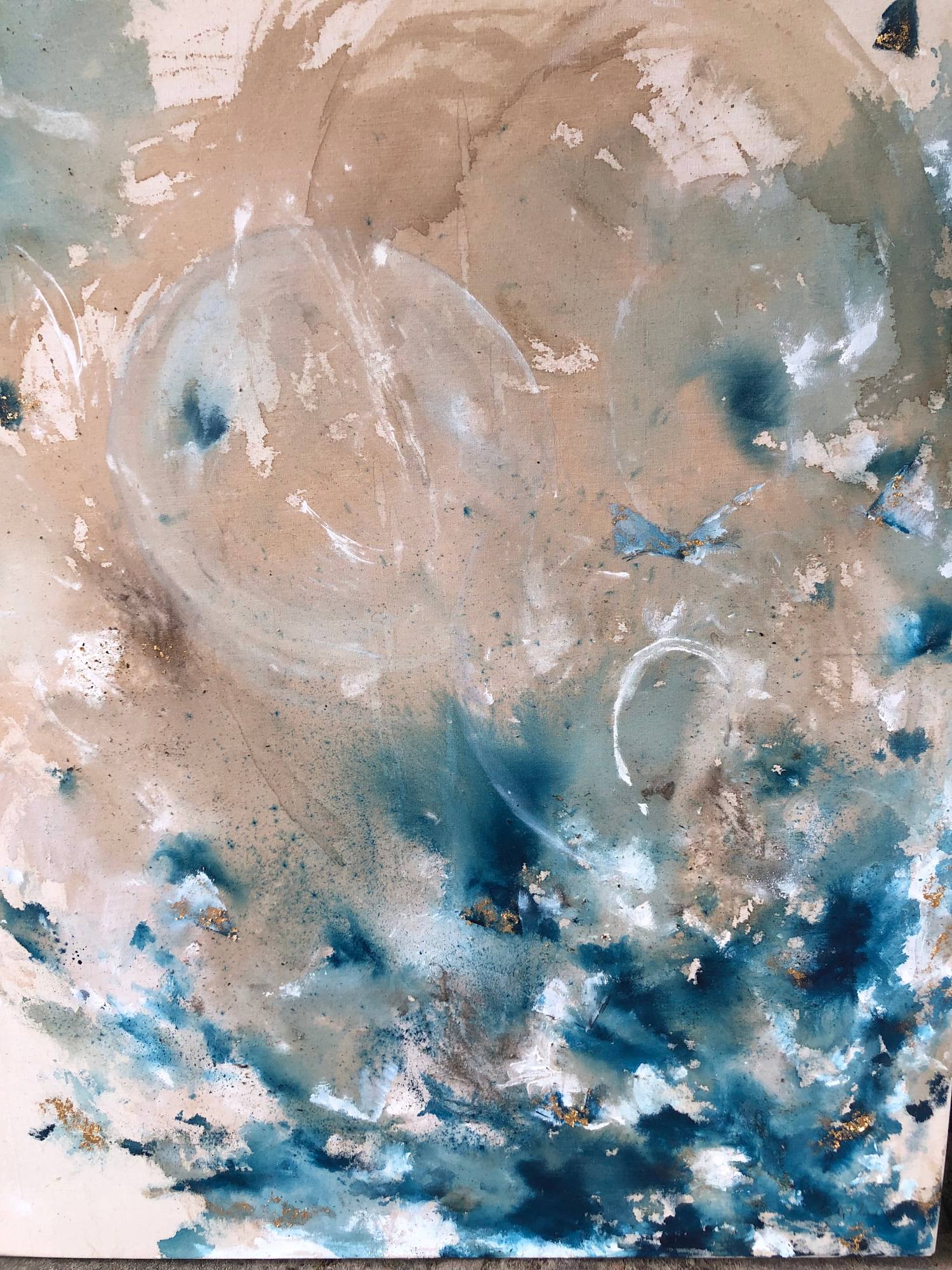Acryl-inkt, -verf, koffie, zand, bladgoud, lijm