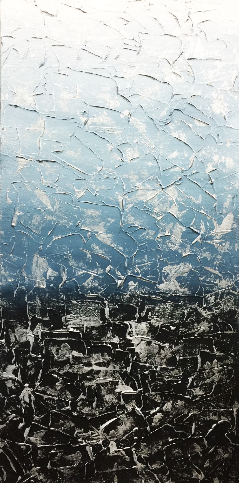 This abstract contemporary textured piece is 12" Wide x 24" High x 1.5" Deep. Shimmering like Moon Light this piece of art has silver metallic paint hitting both the surface of the painting and the top of the textured areas. The sides are painted black and the surfaces are coated with satin varnish. This work was inspired by moonlight shimmering on the Savanna River. A satin varnish has been applied to the painting to help protect it against sunlight and dust. A Certificate of Authenticity will accompany the artwork.