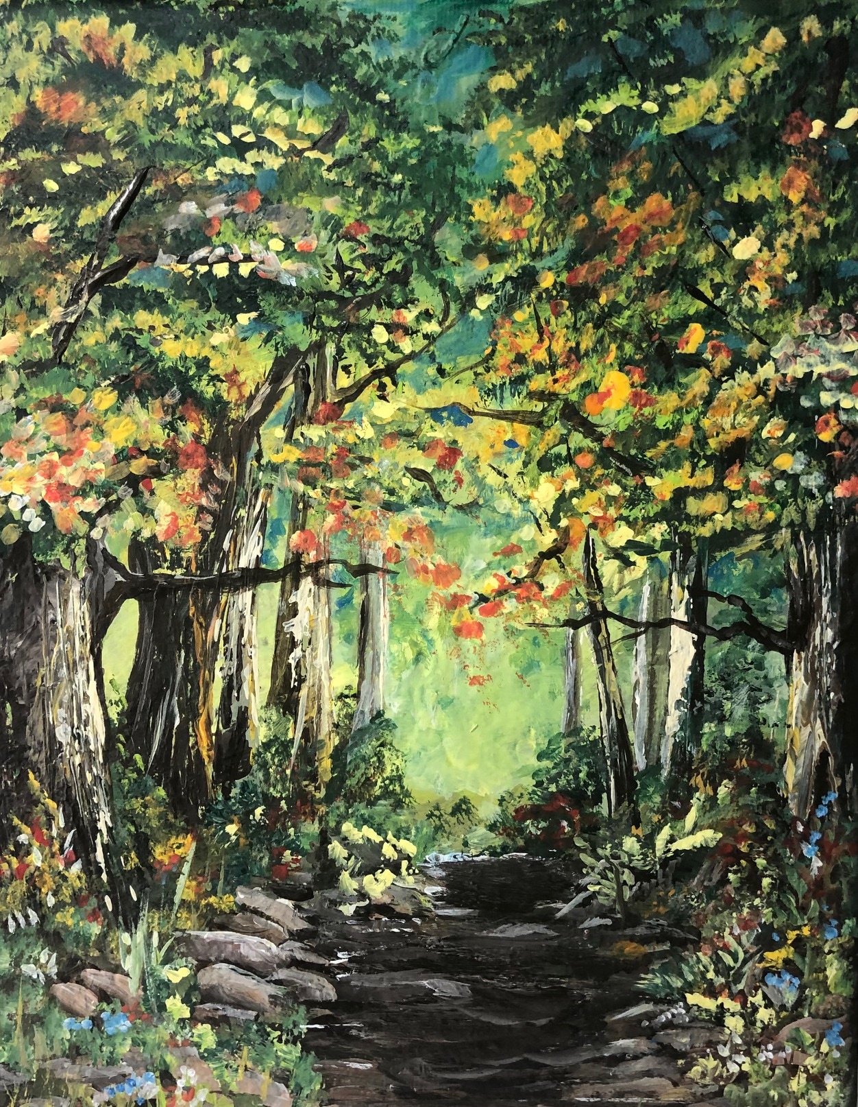 Happy Trails evolved from my imagination, and from images through the years of wooded pathways disappearing around a bend. I've always loved walking under the arches formed by their branches. I hope you will love this visual stroll and find peace and joy there.