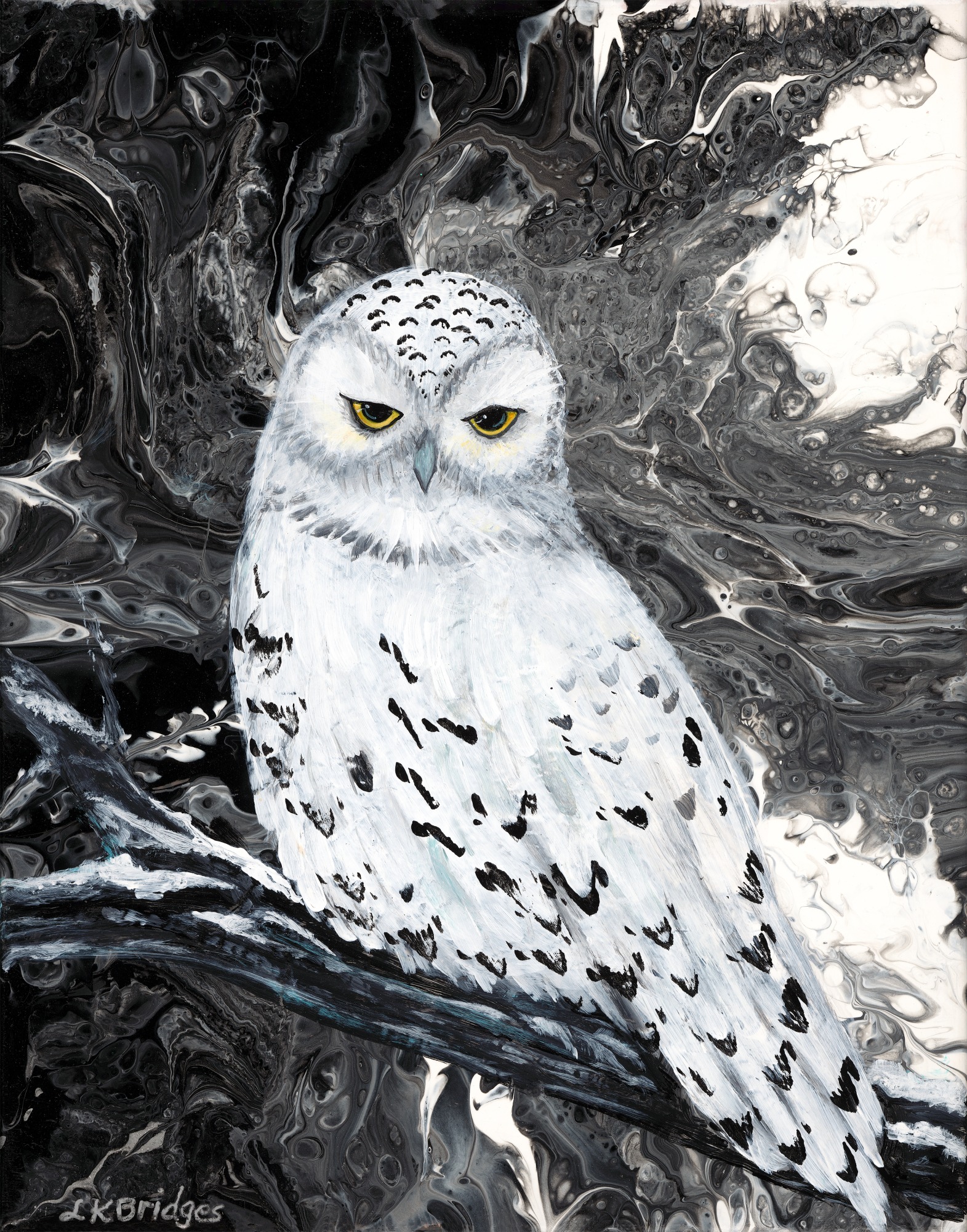 This stylized snowy owl is gazing back at the viewer with her beautiful yellow eyes, She is perched on a branch in front of the abstract black and white acrylic pour background. It comes framed in a black floater frame, ready to hang.