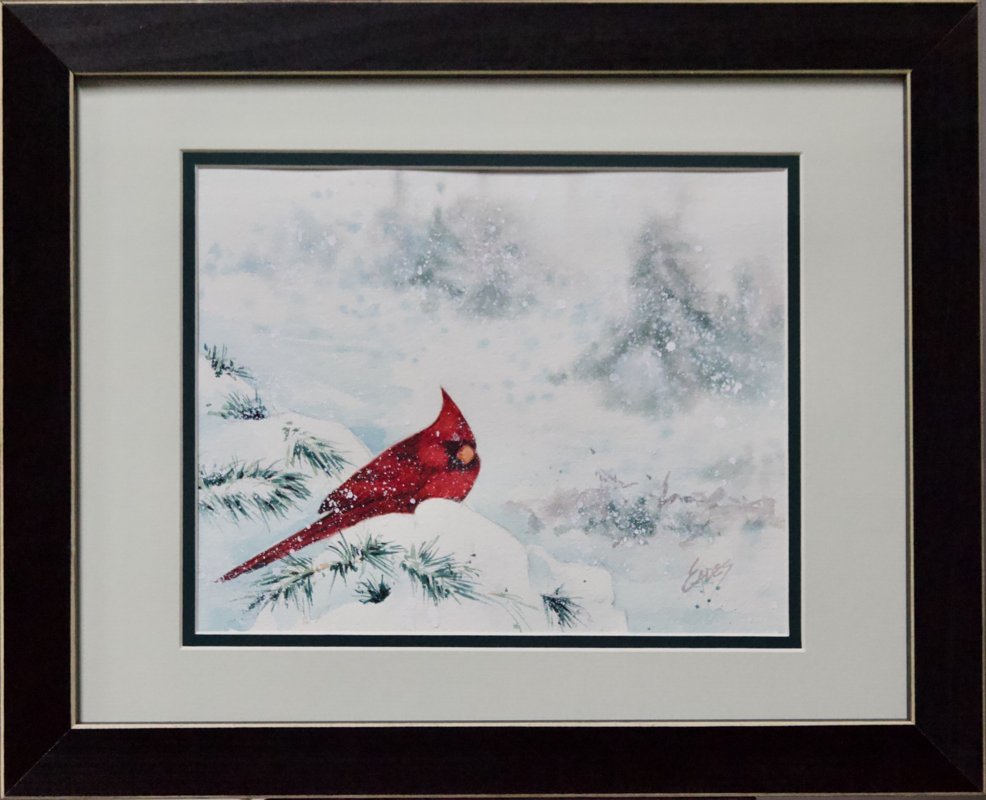 A cold winter day, but this bright Cardinal is enjoying the beautiful scenery. The image size is 8" x 10 " matted to 11" x 14". This painting is framed and ready to hang.