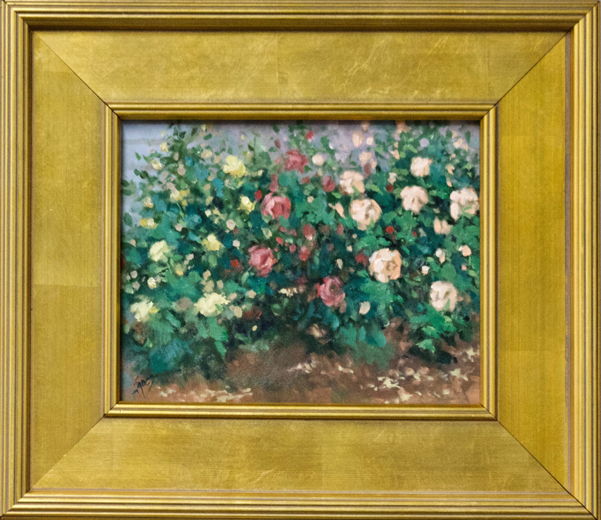 A friend sent me a photo of her roses and I just had to paint them. Loved working with the lose style and pretty colors. A cheerful piece that would look wonderful on your wall. Framed in gold, this piece measures 14"x16" x2" and is wired and ready to hang on your wall. The art measures 8"x 10" unframed. This painting ships free in the continental USA.