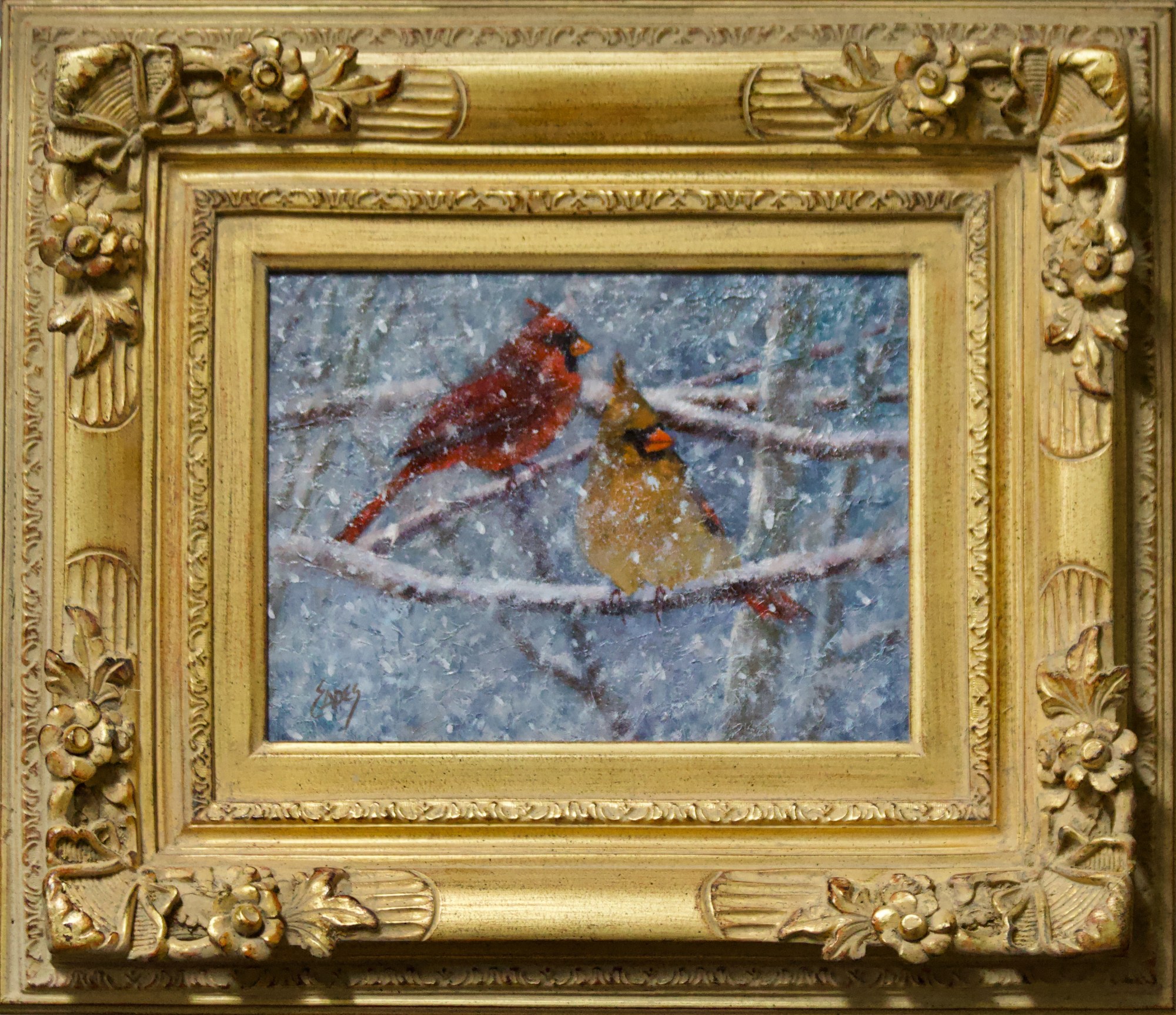 Oh this Frigid Pair actually seem to be enjoying this weather, They do look pretty fine in that falling snow. The image size of this oil painting is 9" x 12" and the overall framed size is 18" x 21" x 3.5". It's ready to hang.
