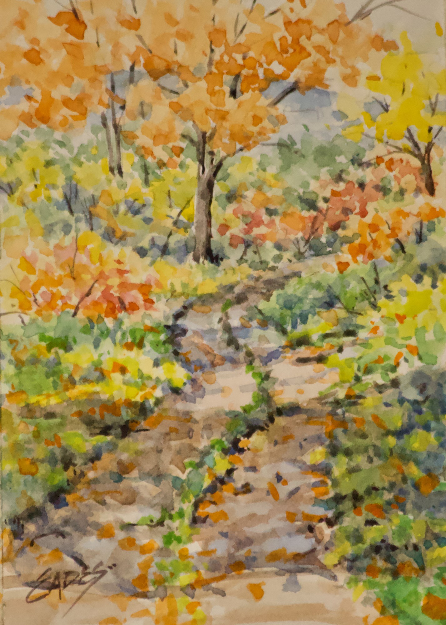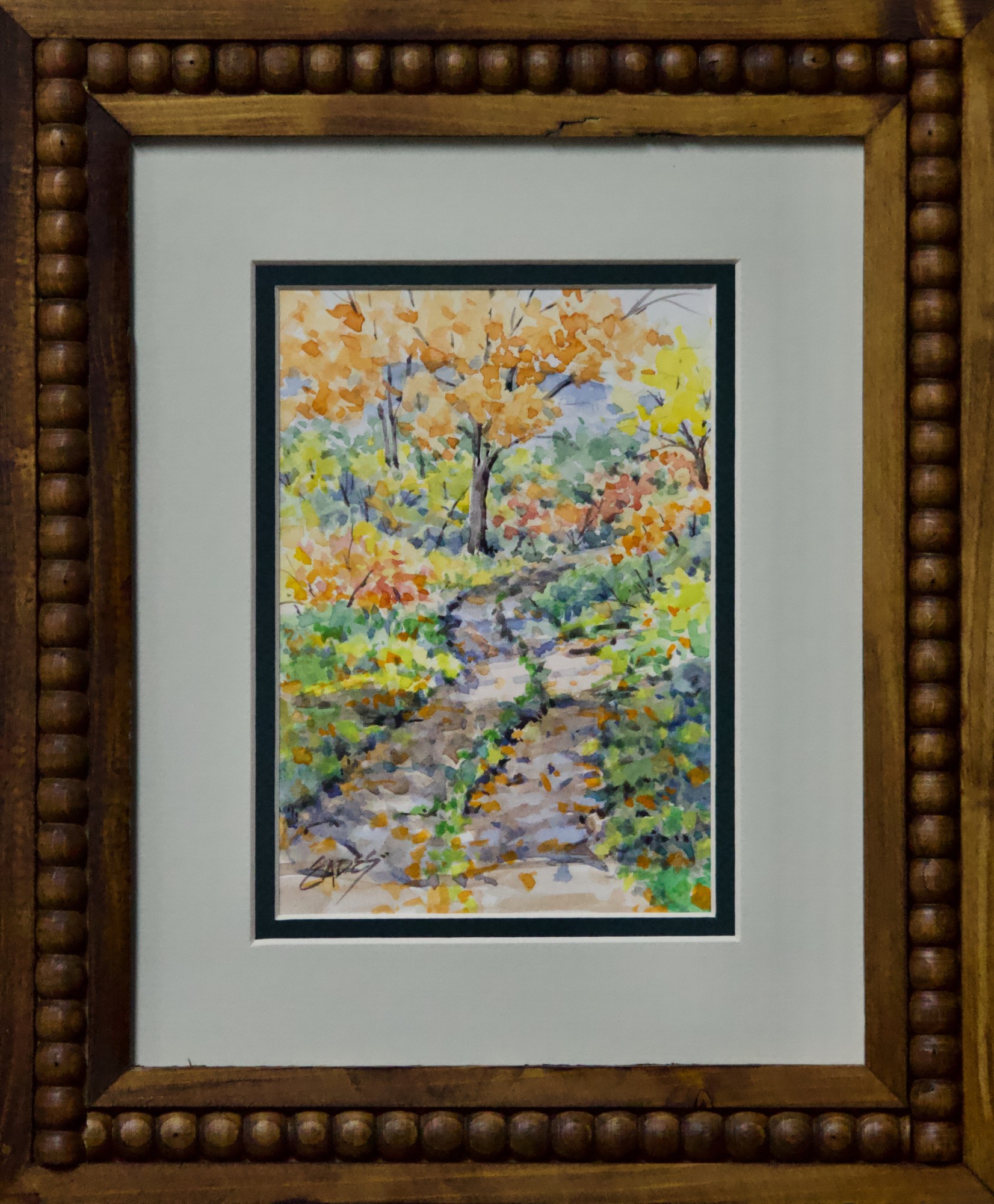 What an inviting Country Road. Let's Hike right on into Autumn, This watercolor is ready to hang.