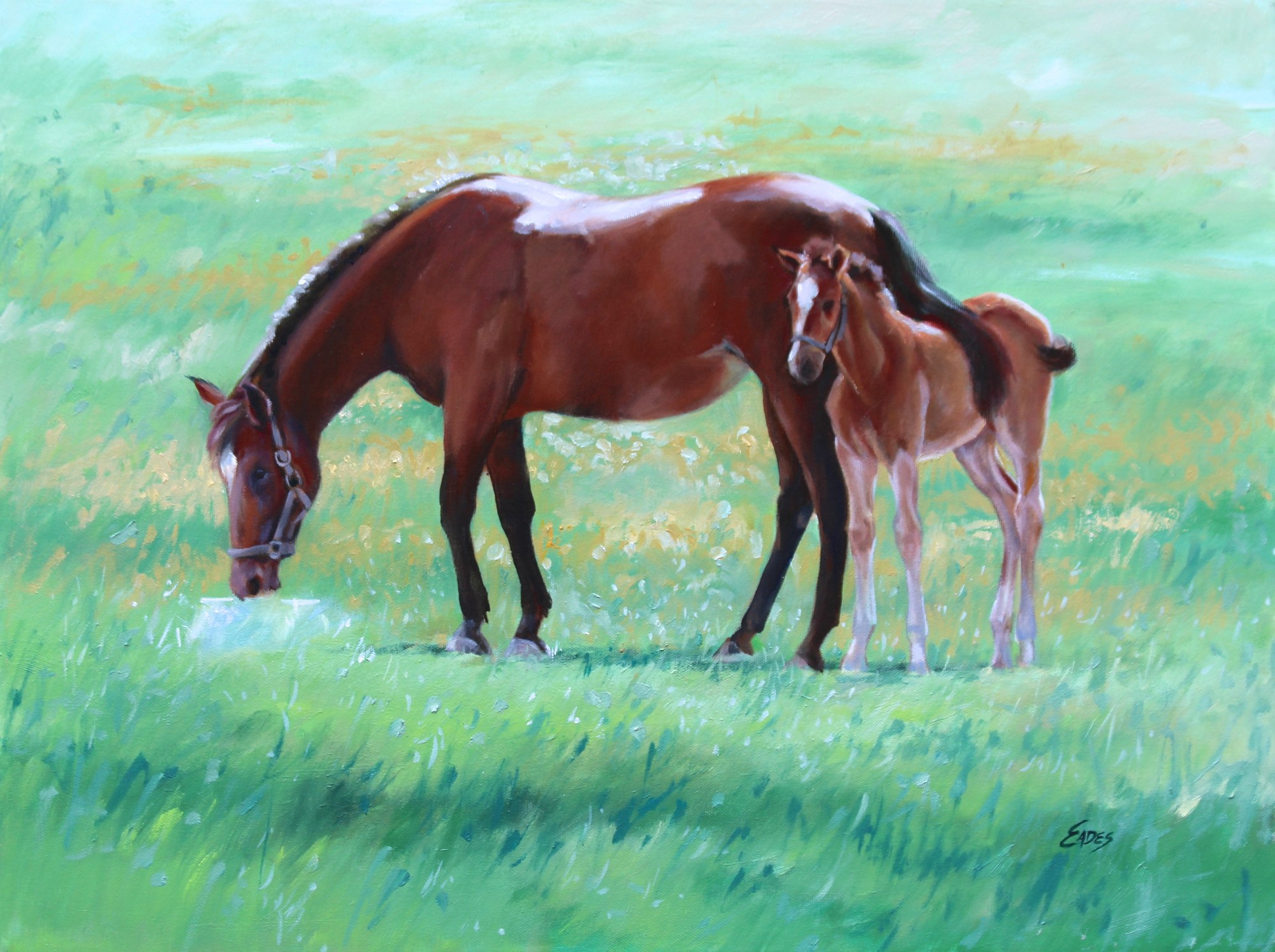 Mother and foul in the paddock... the Mare looks to have her tail protectively draped over her baby. Such a lovely site. The image size of this painting is 18" x 24". This painting is available.