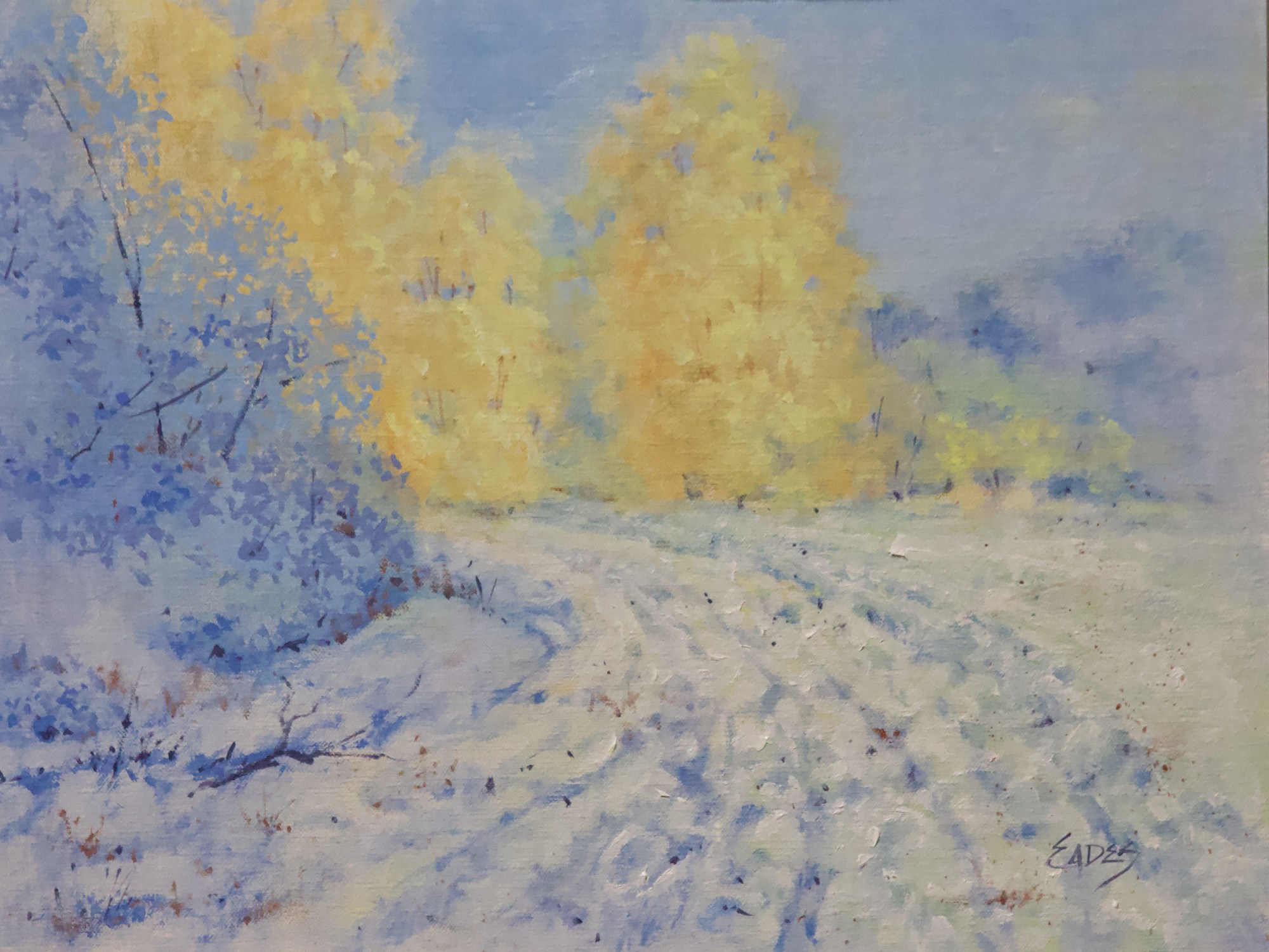 I love snow but not crazy about the cold. I take as many photos as I can for reference to paint from in my cozy warm studio. I am fortunate to be able to visit the snow with my family and love to go tubing when possible. One of the places we3 often go usually has a huge bon fire burning and Hot Chocolate available. What fun! I do so enjoy painting snow scenes and they bring back wonderful memories of Snow Days in Tennessee, when schools would close because our school buses could not safely run. Wonderful times I will never forget. I hope this painting will bring back some of your precious memories. Ice in the Shadows is painted in oiks on a 12" x 16" Linen Panel.