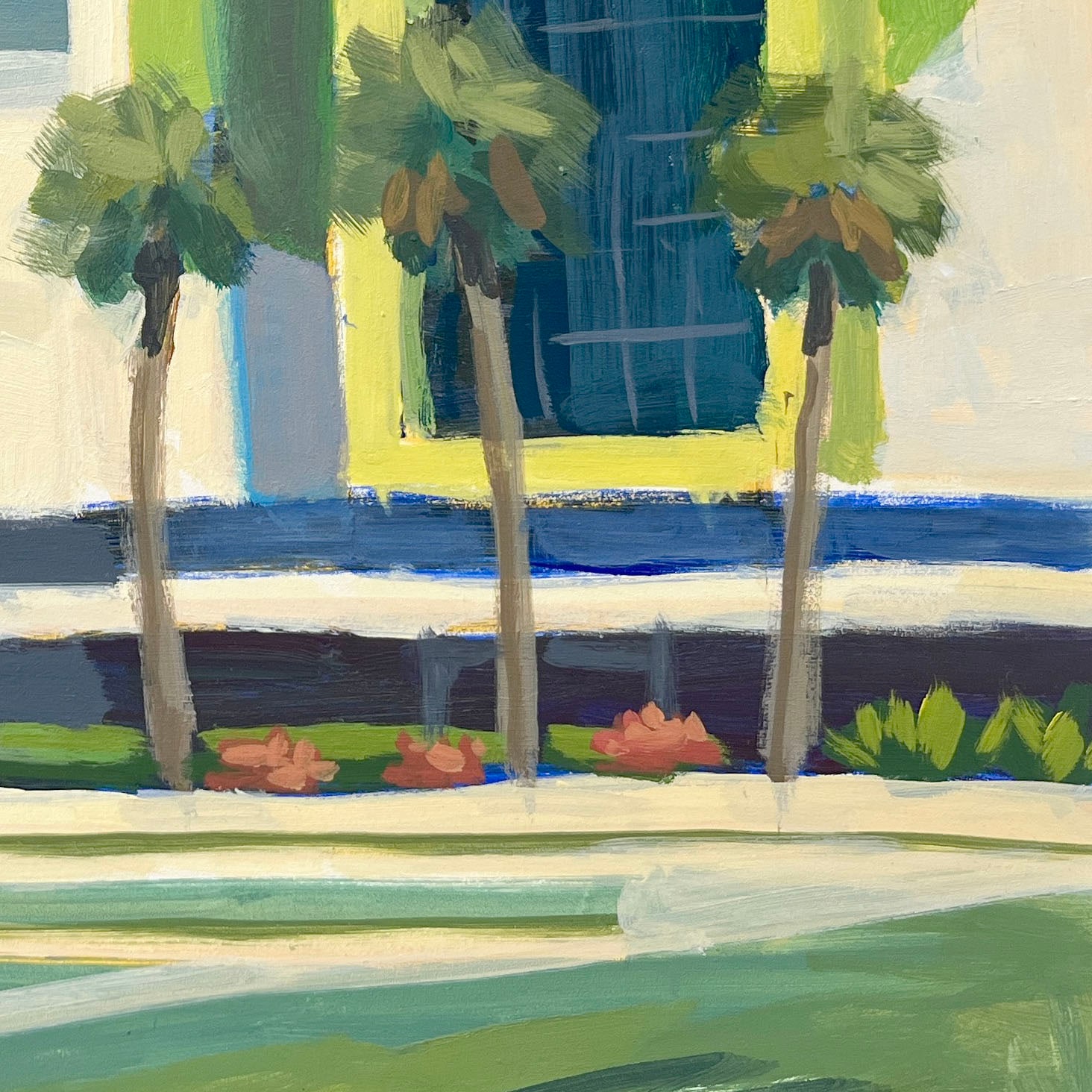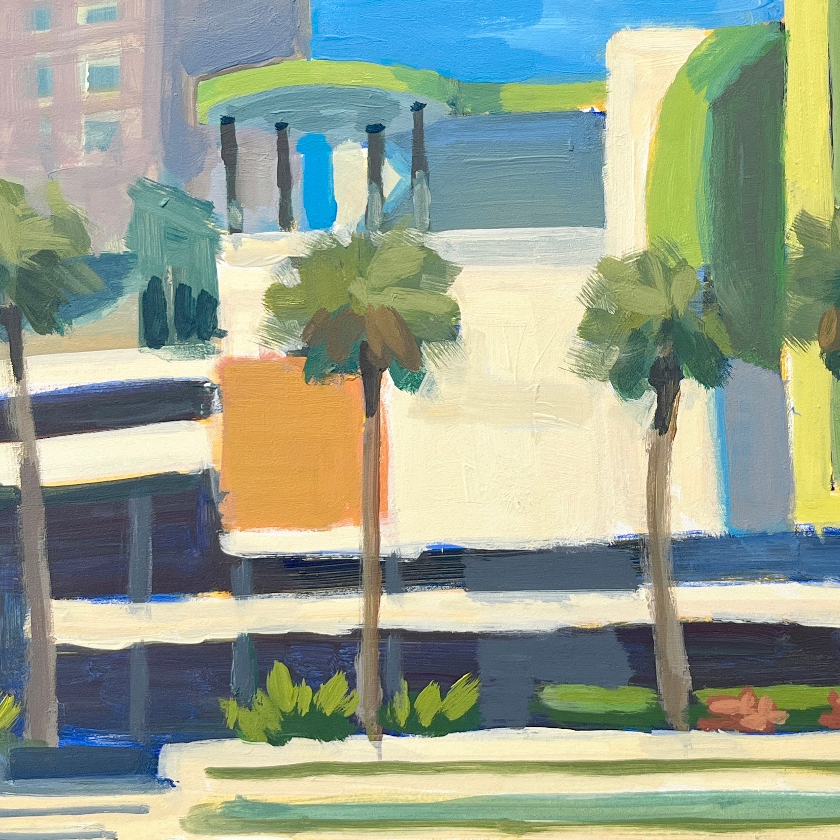 Bright colors and simple architectural shapes are silhouetted against the bright blue sky.