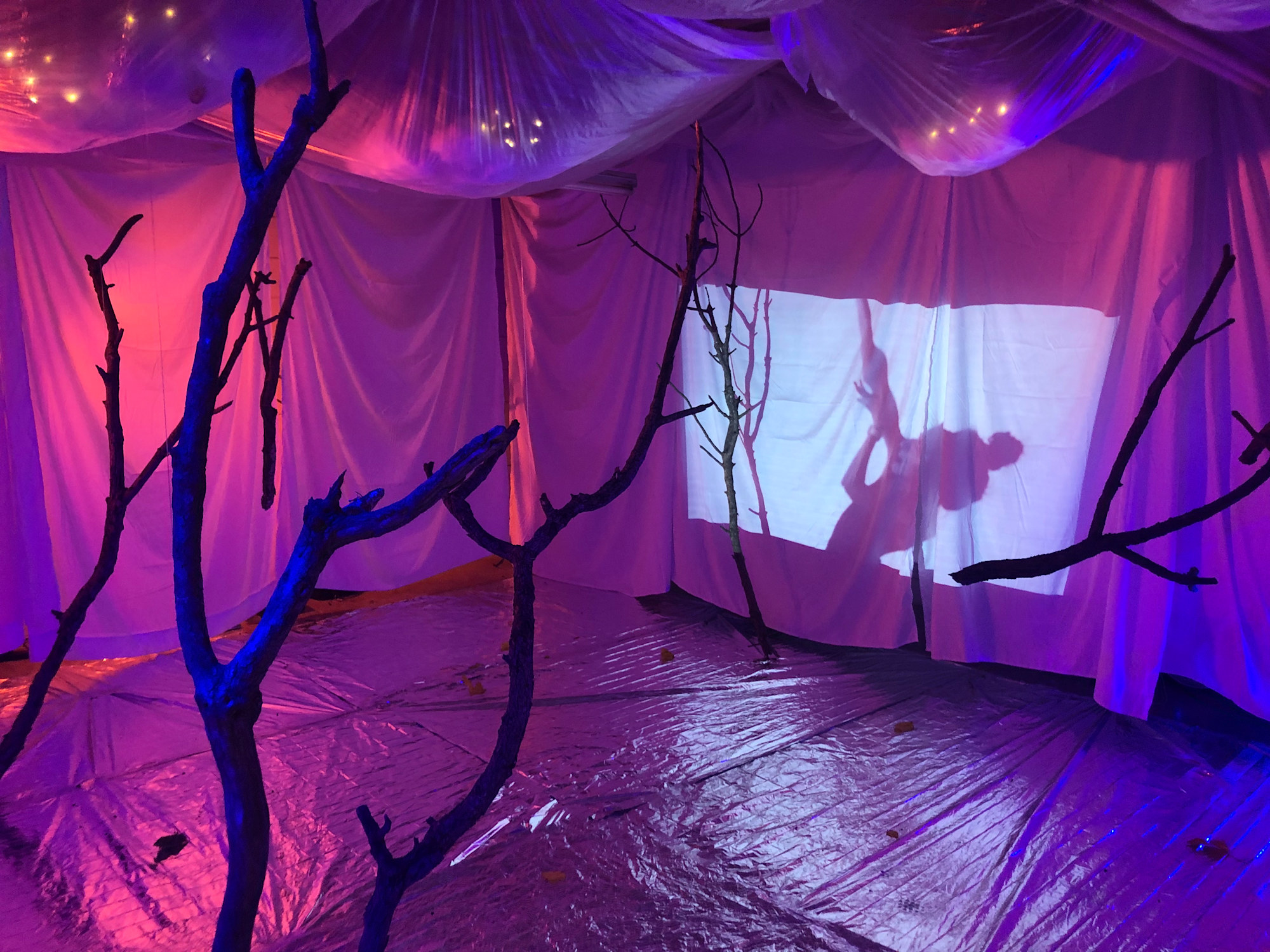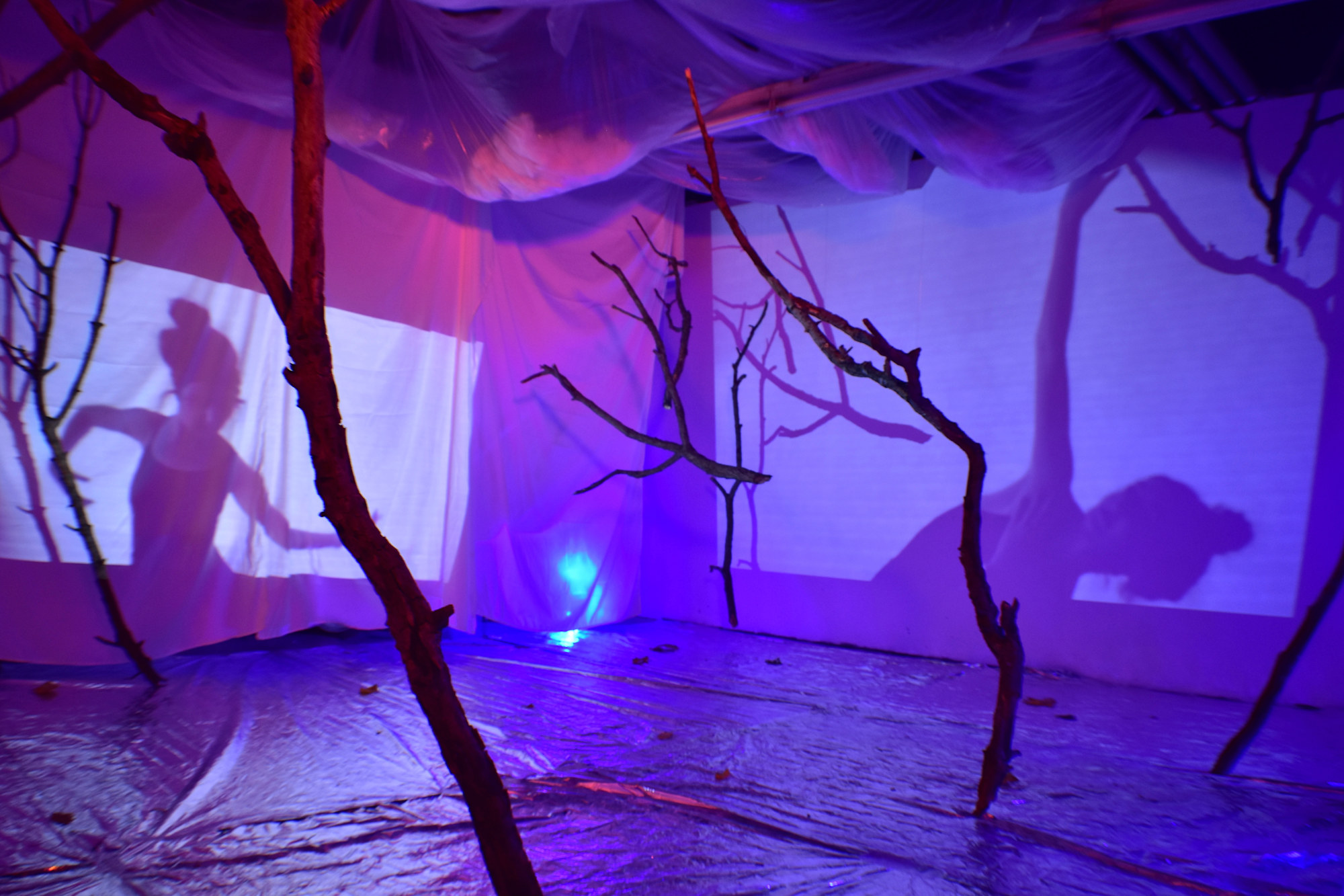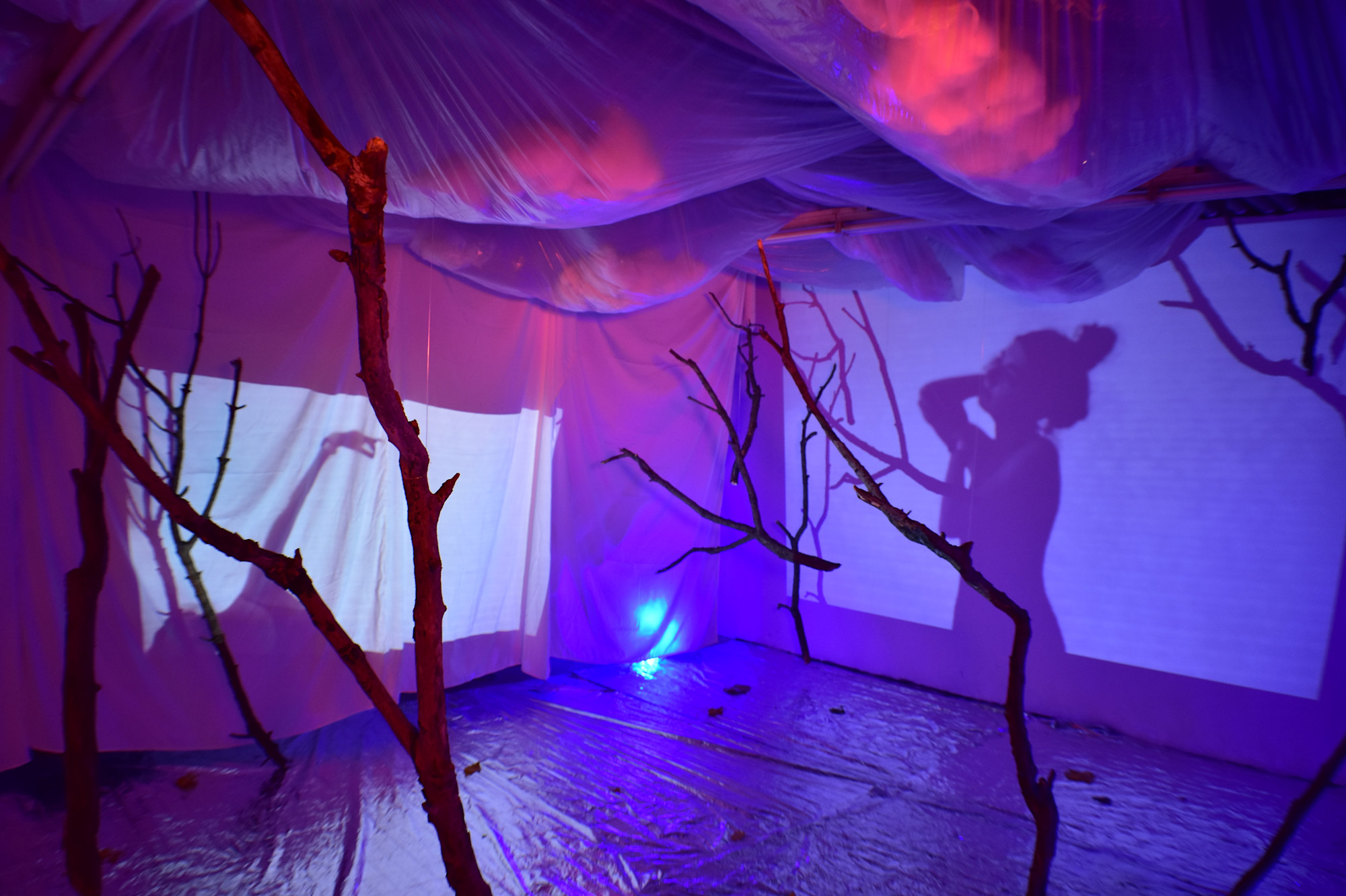 This installation is a self-reflective experience that speaks about the perceptible natural movement of air. These natural elements cannot be visible to the eye without the movement of objects around them. Through light and shadow within the space, there is trace of human posture and natural forms, creating a familiarity to a rooted in connection of human and nature. The natural forms take on figurative elements and lead to an impromptu dance between the viewers and the space. This interaction is ephemerally recorded and cast through shadow. Similar to the performance that the trees put on for us daily. The dance documents a visible form of outside elements, growth and decay, and the comparable silhouettes to the outside world. My intentions are for the viewer to recognize their presence by joining in this intimate natural rhythm.