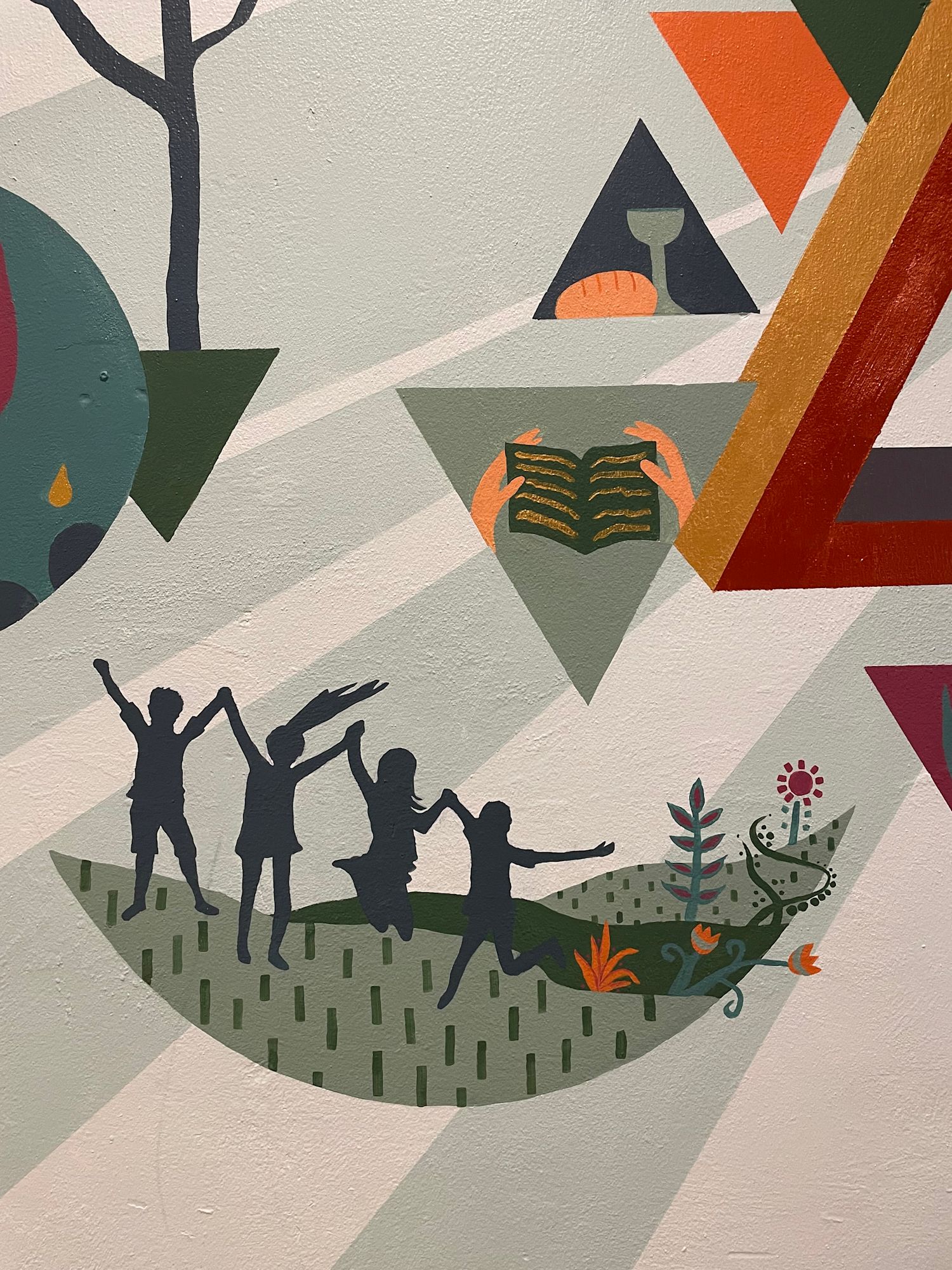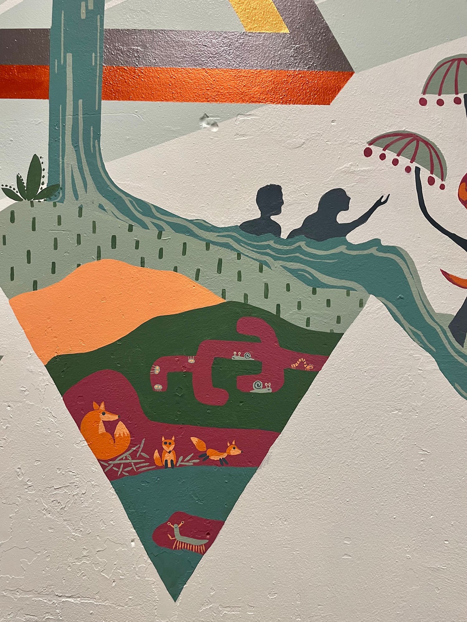 11ft. X 22.5ft. Mural collaboration by Atlanta artists Lindsey Veil and Kellly Irby. We prepared the wall by dusting and cleaning it. Priming the wall first allows the colors to pop and the paint to stick to the surface, but the wall was already painted white so we didn’t need to prime it. The finish was ready for the paint. Although the mural was in a large hallway, the client wanted the mural to tell a story as one walks by. Gold, silver, and copper metallics bring the story to life in the lighting. We accomplished this by breaking the story into basic shapes that blended together. The client was very happy and the mural was a huge success!