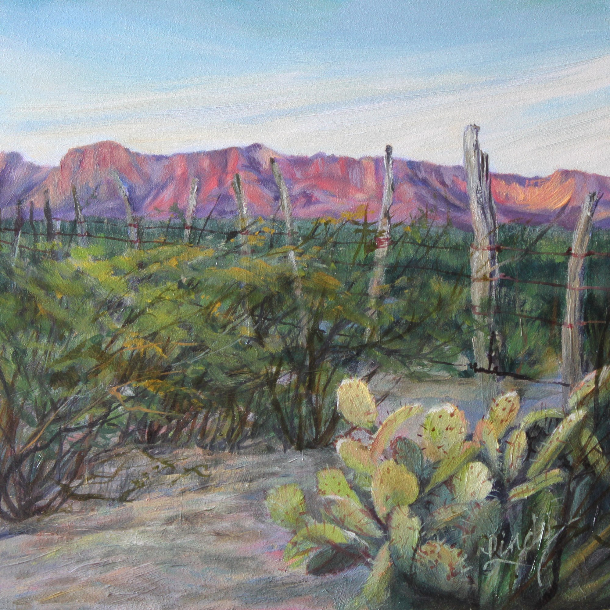 Sunrise brings out the softer side of the desert. Prickly pear cactus pads are fleshy and green, refreshed by the cool night. Framed by an old barbed wire fence, West Texas mountains are rose-colored. With dawn, comes a whole new set of possibilities, and everything feels renewed.