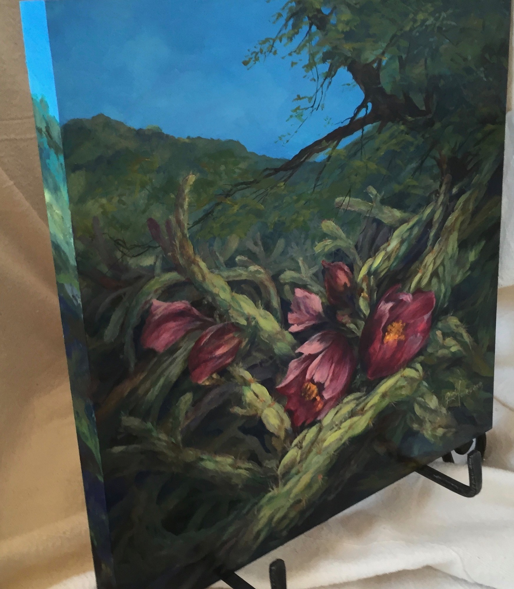 This oil painting is self-framed; the painting wraps around the sides of the wood that cradles the archival gessobord.