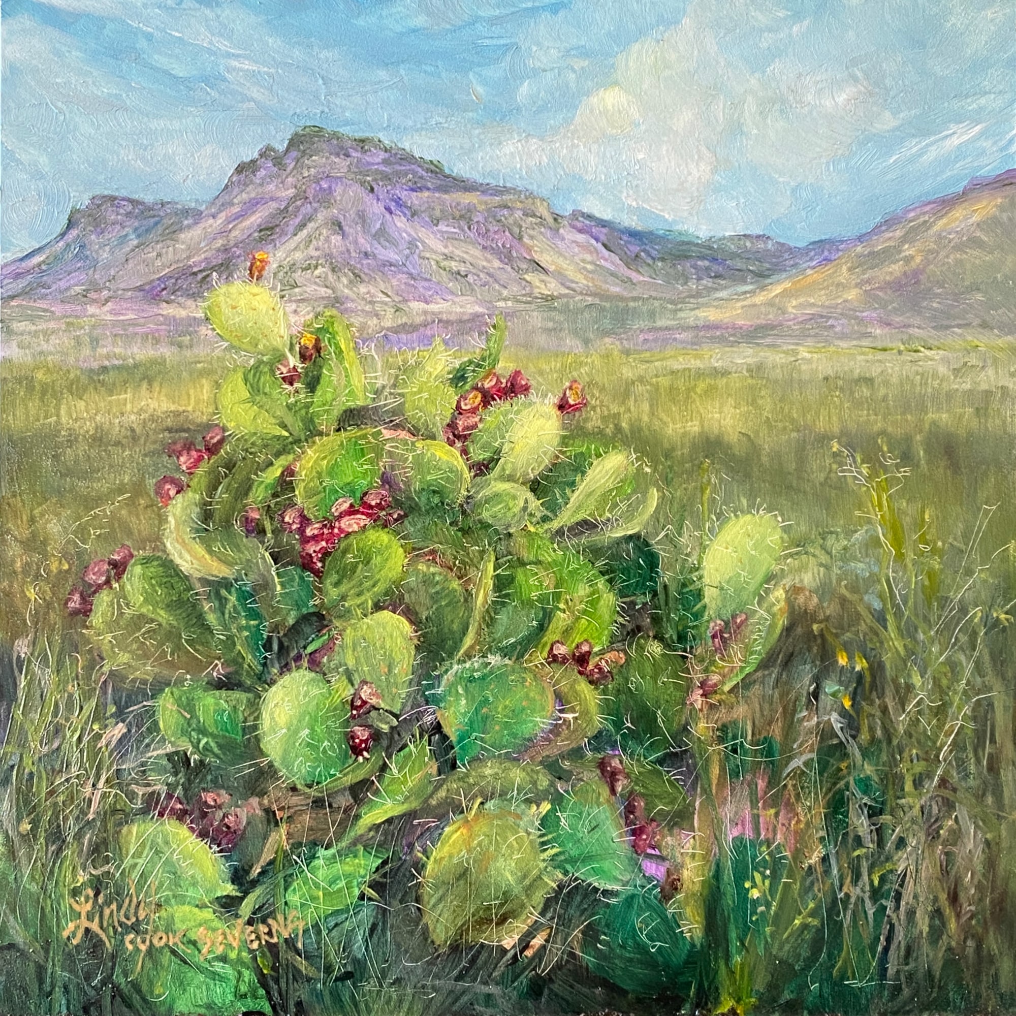 Cactus adds a splash of life and color to the austere desert landscape, and it can be remarkably long-lived. This prickly pear has spent its entire life in the giant shadow of Blue Mountain outside Fort Davis, Texas, and it's proud to claim that it has prospered on this ranch land for so many seasons, it counts its age in donkey years. While this painting is about the cactus, the green high desert pasture and the softly colored mountain fill the background with other silent stories.