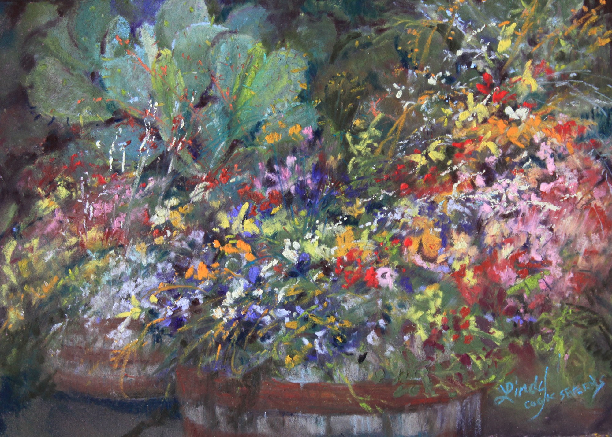Prickly pear seems right at home with these pansies and begonias and poppies blooming on a sidewalk in Texas hill country. In true Texas style, this Gruene establishment had freely planted cactus in barrels right along with the garden flowers. This painting is all about that profusion of color.