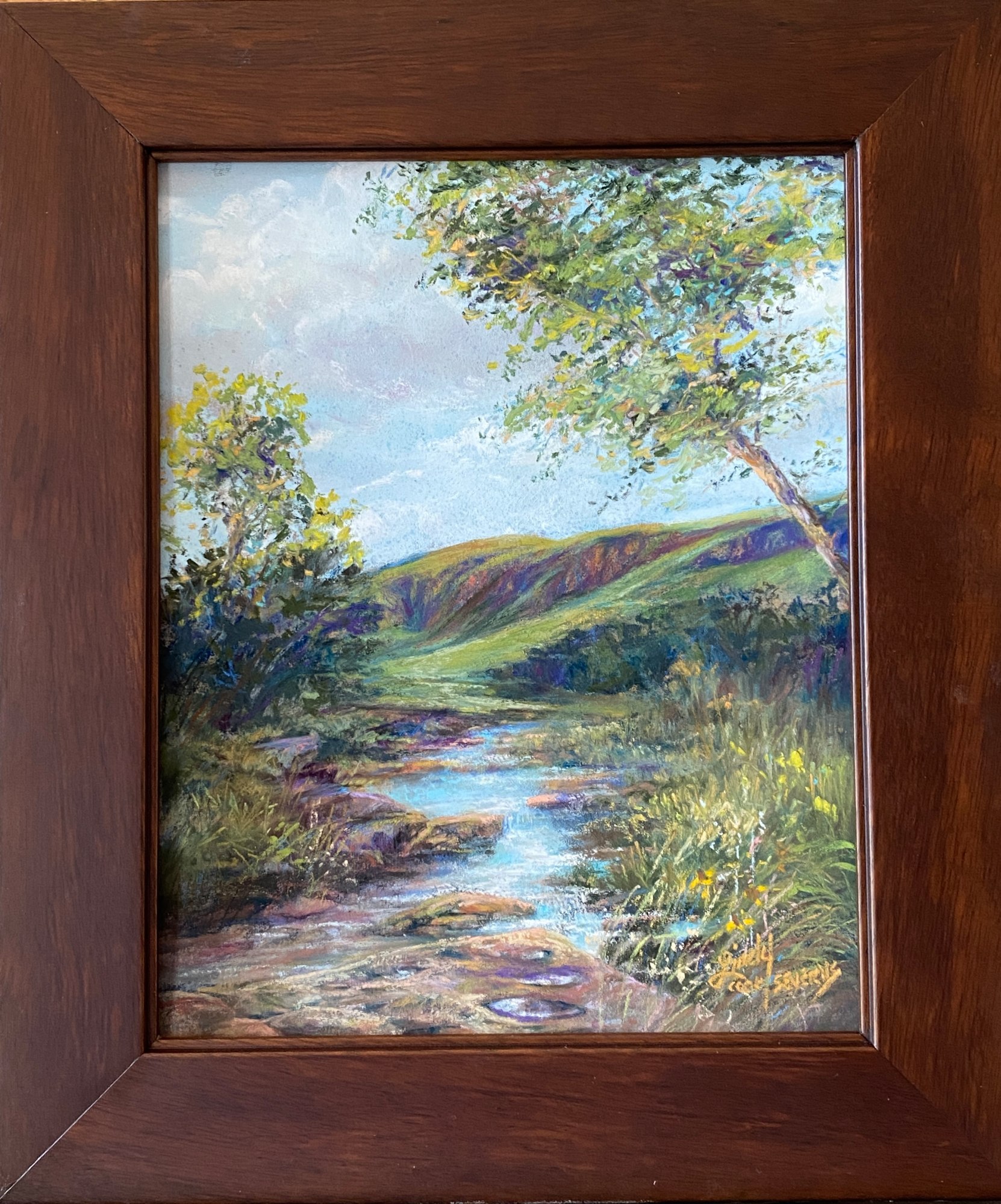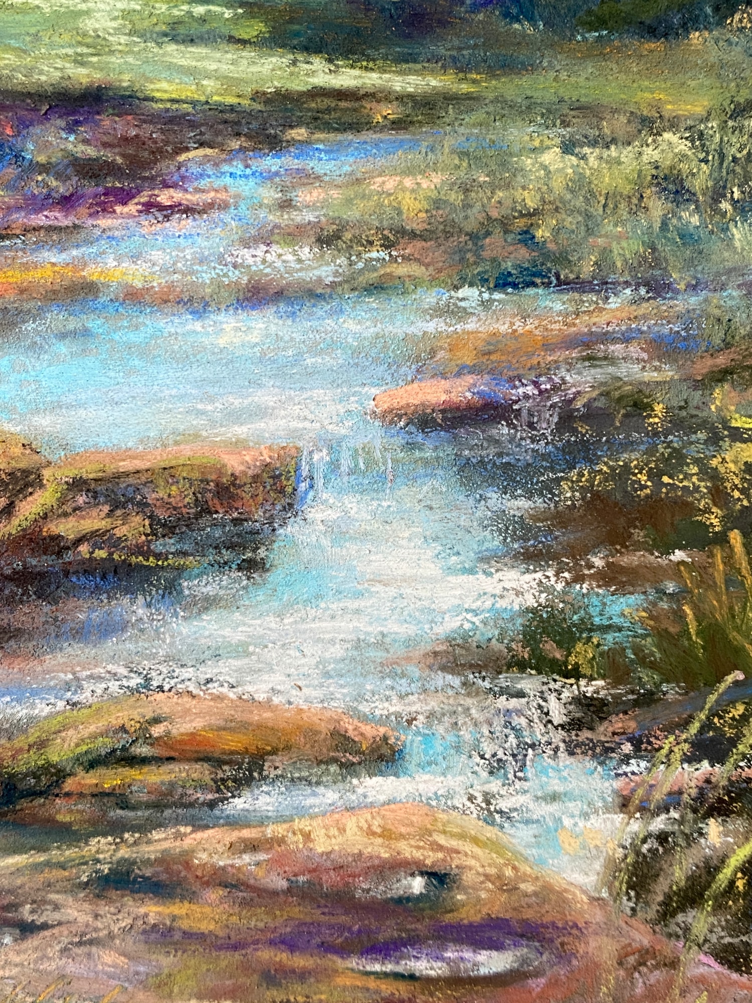 This new pastel is of one of those wet roadblocks we keep encountering in our travels to and from the river. On that day, as Jim gritted his teeth and skillfully turned our heavy duty pickup truck around on a stretch of dirt road a little red wagon's turning radius would exceed, I noticed the nearest water-filled rock wasn't just holding water. It was deeply pitted with ancient mortar holes. Native American grinding stones. People have lived in semi-arid Far West Texas for ten or twelve thousand years. Winter and summer, spring and fall under the Texas sun. And always praying for rain to muddy their paths.