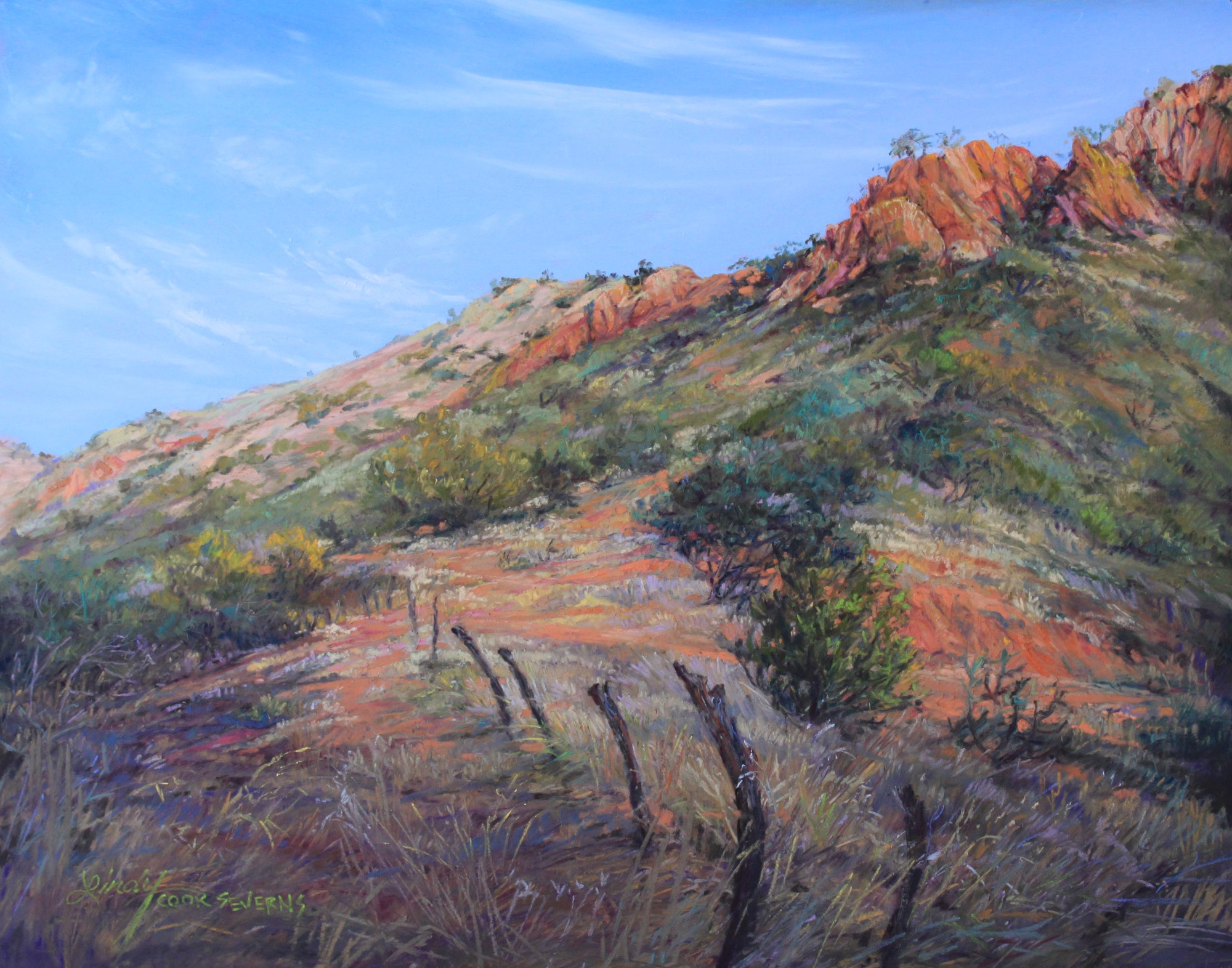 These twisted old fence posts were probably sunk into the rocky volcanic soil of this Texas mountain over a century ago. Hints of converging ranch roads are still visible on this heritage Davis Mountain ranch. No matter which path we take when we hike this mountain, the scenery is breathtaking. I especially love the way the red rock cliffs play against the true blue Texas sky.