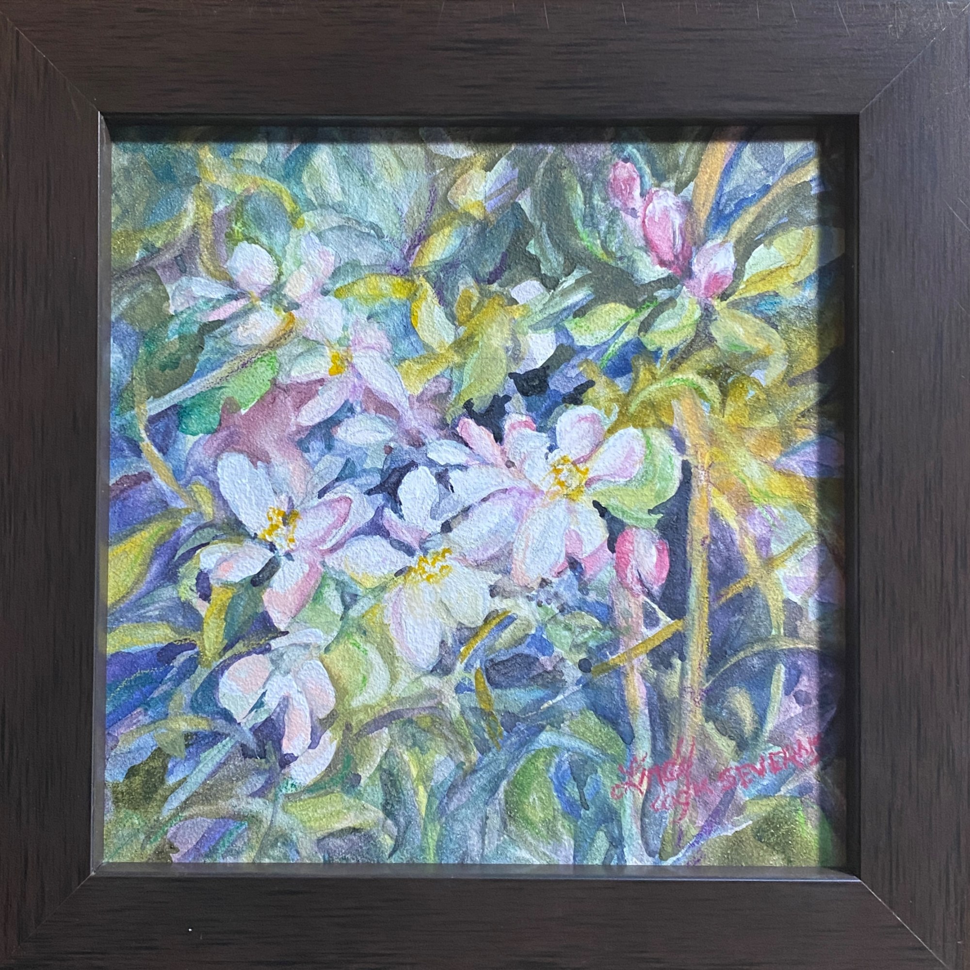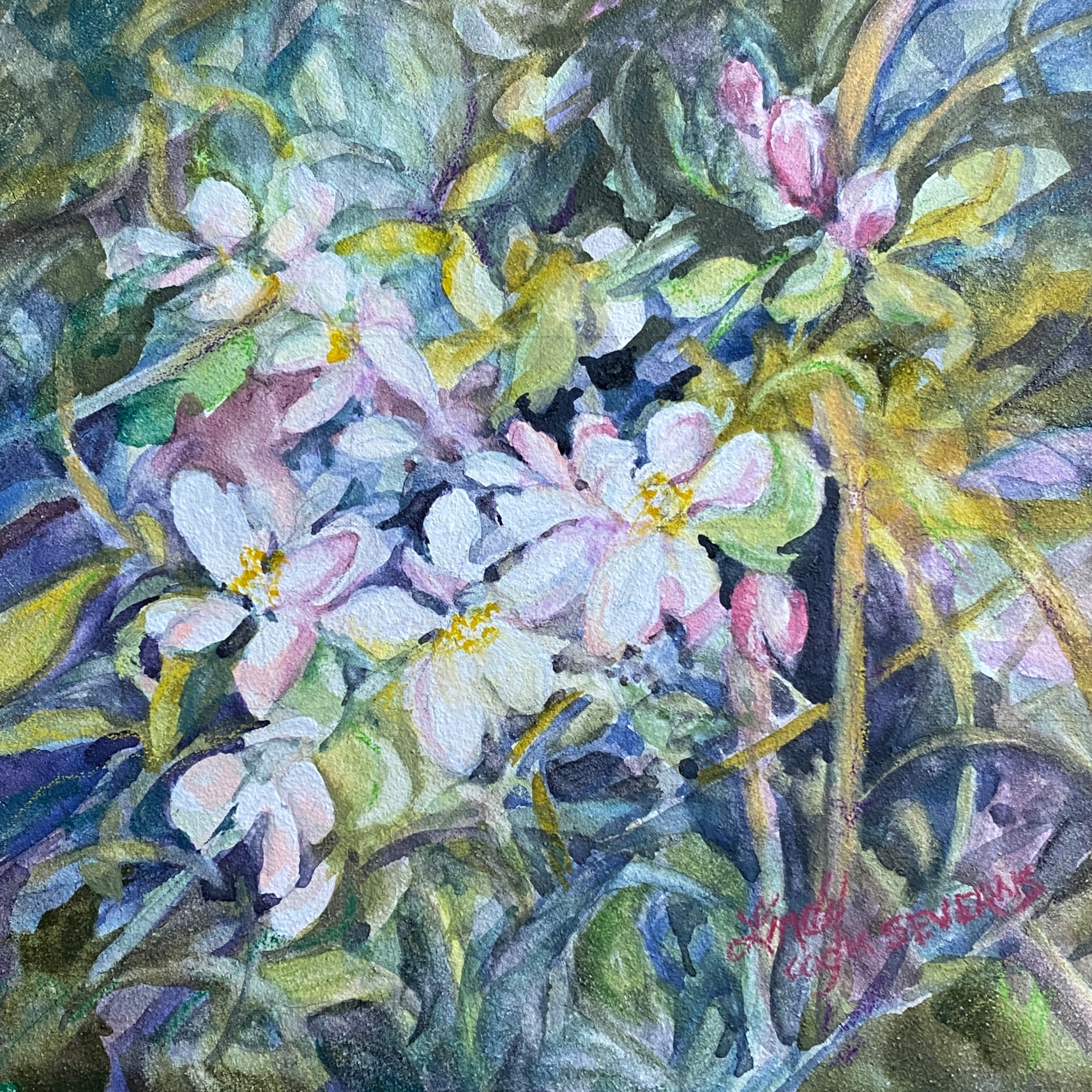 Apple blossoms, with their first blush of pale color each spring symbolize hope and renewal rooted in the constancy of the changing seasons. In this small painting, I used rich, deep background colors to contrast with the white and shell pink petals, and to create a maze of foliage and branches behind the blossoms. This background is as important to the artwork as the flowers because it invites you to enter this painted world and escape into the wordless awe of color and shape art can inspire.