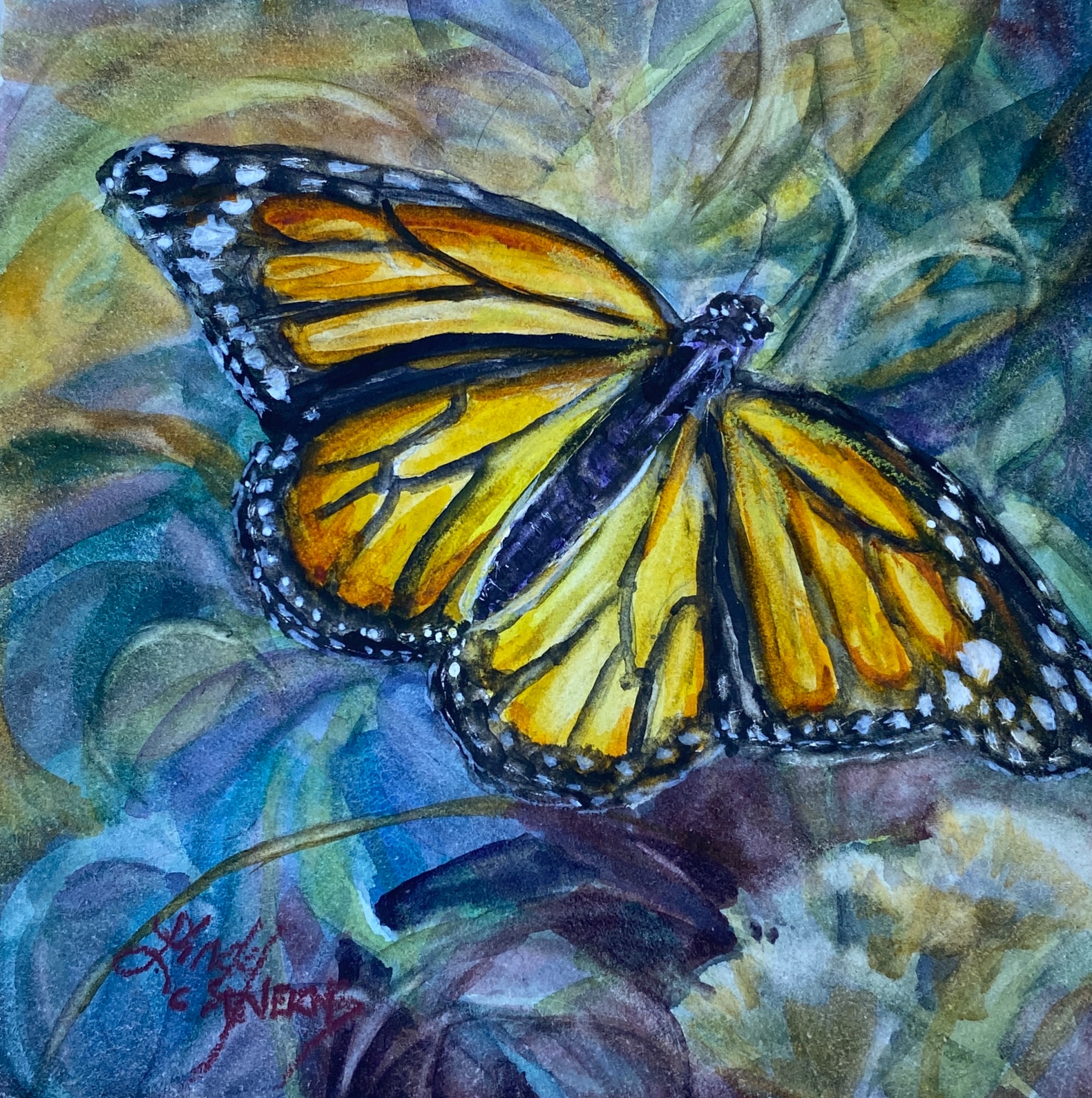 Done on archival Aquabord, this painting has been varnished with an archival matte coating to protect the rich colors. It does not need to be under glass, and is suitable for display on a table easel or hanging.
