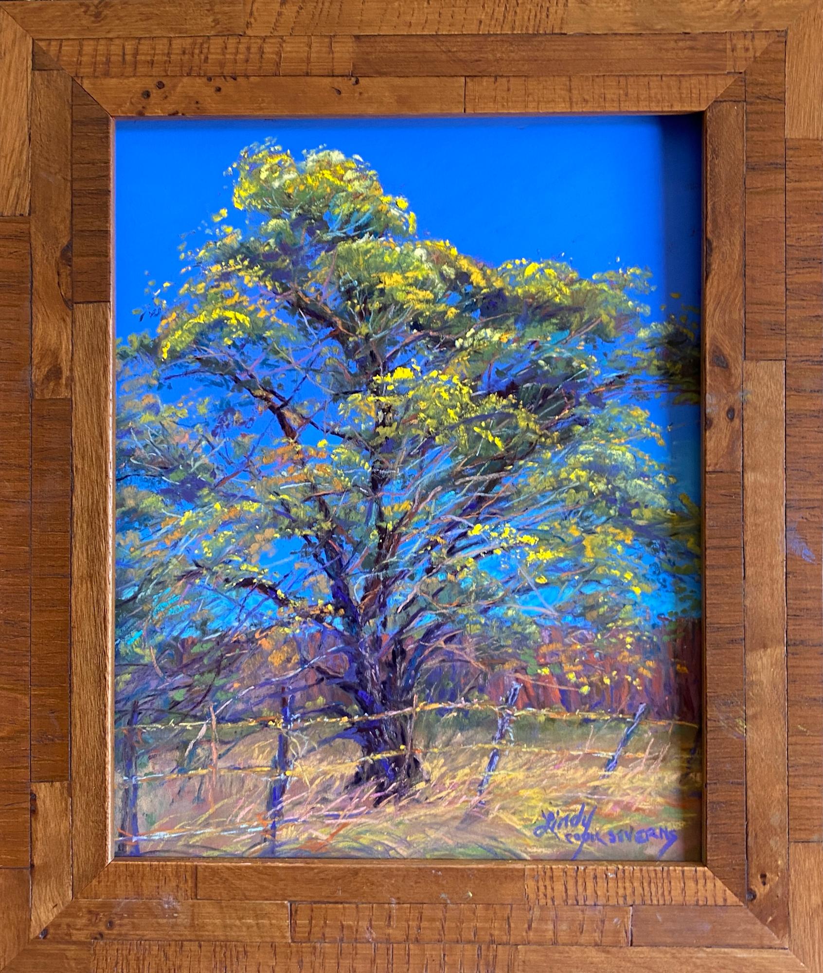 At a loss for a title that would preach, I sought fresh eyes. Good friends Andy and Diane got a glimpse of him before the painting was fully polished and suggested I call the painting "A Hint of Color Around the Edges". Good. A second email added, "It’s a really happy painting, as if the tree is smiling! Even the barbed wire!"