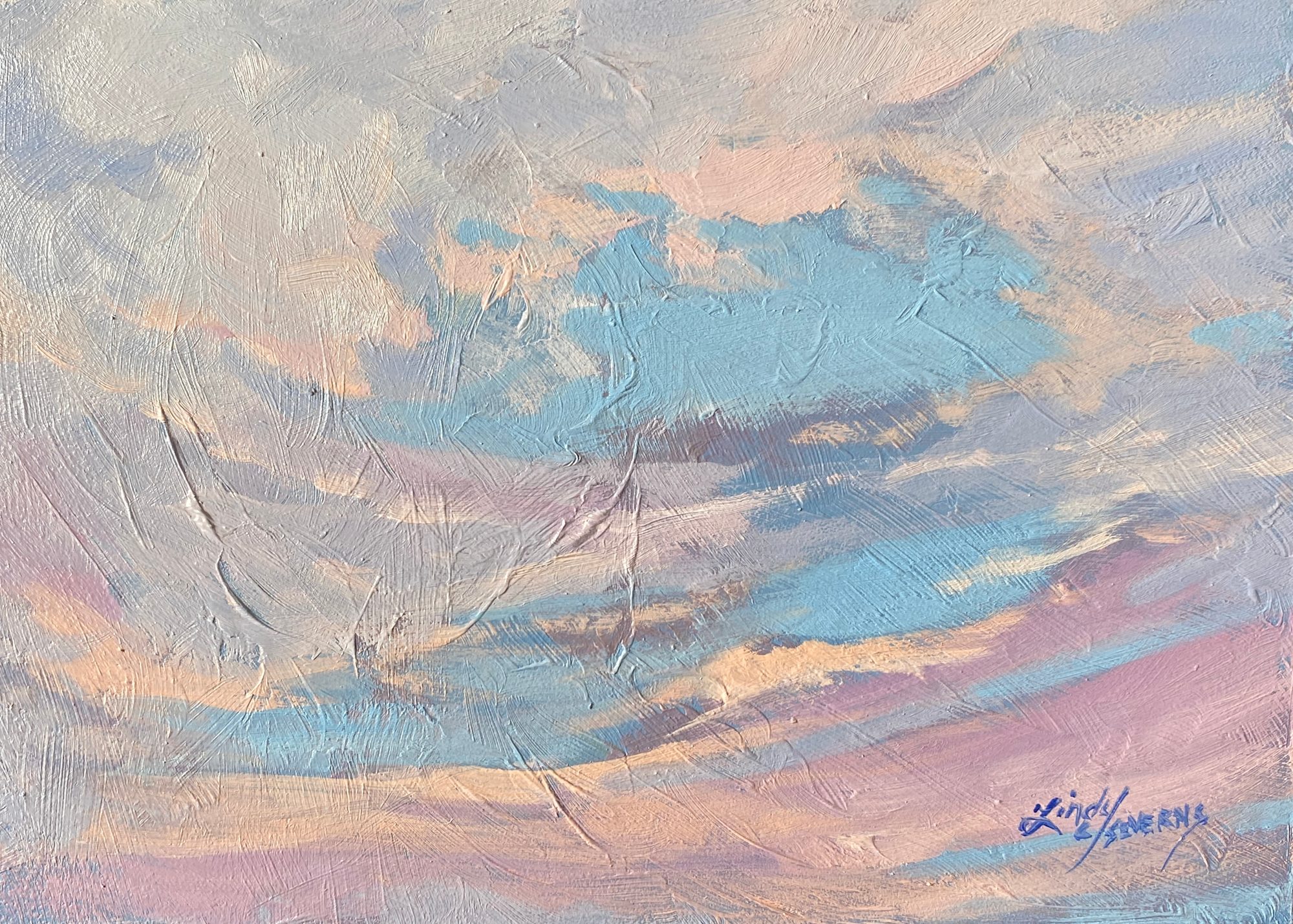 Nature often mirrors our own emotions. I laid the brushwork as I contemplated an exciting opportunity; the calm blues, soothing violets and hot pinks followed, along with that sense of tranquility that comes with having made a decision as to which path to take. So the visibly dynamic brushwork captures not only the fleeting beauty of a sky in transition, but also the anticipation of an artist on the move.