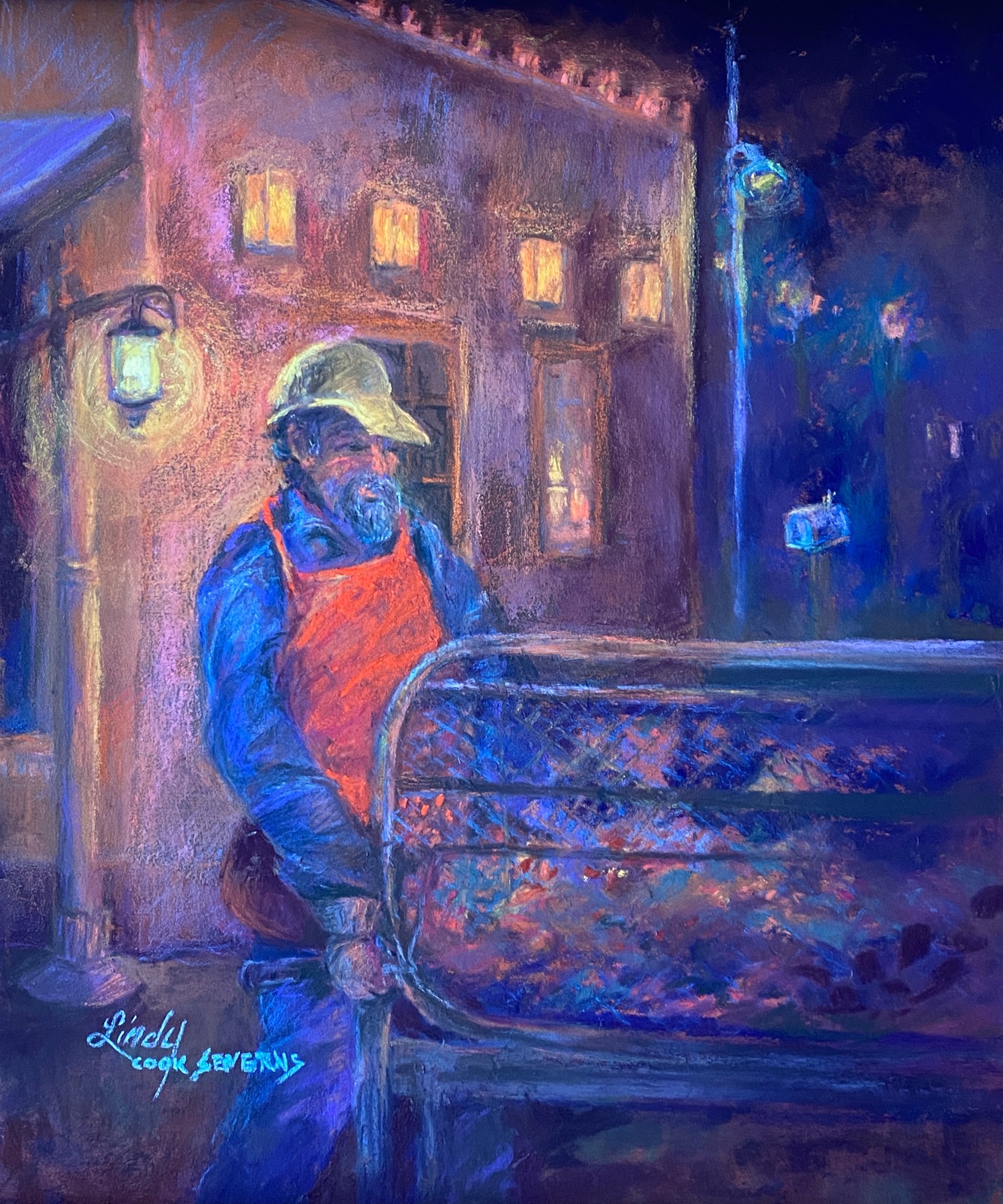 Roasting green chilis over hot coals is an art appreciated by many. Whatever he does by day, by night, this man dons his red apron to become a superhero to chili lovers.