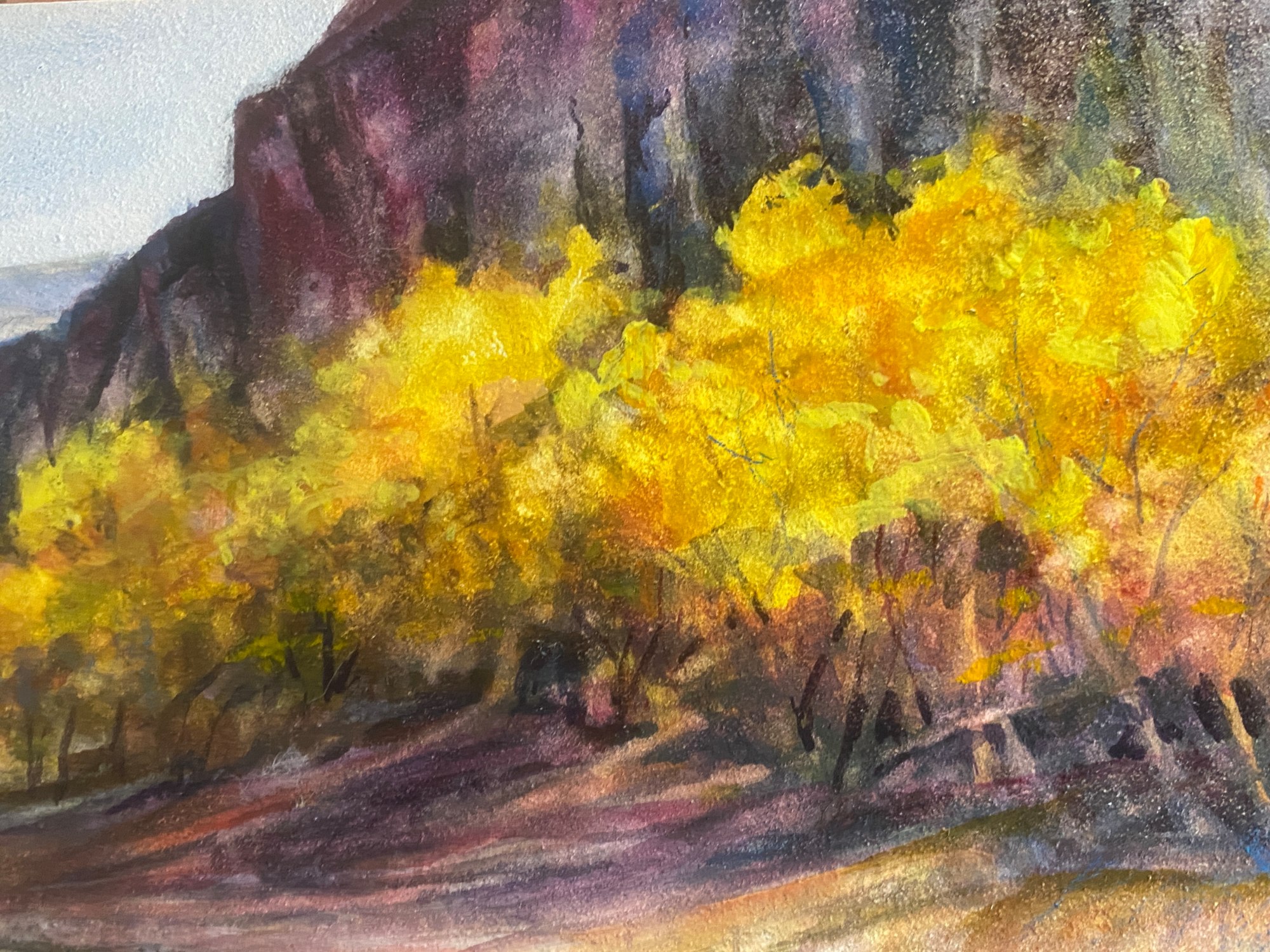 The bones of this painting are set in reality. But the mood is cast by color, which I created by willingly suspending my own disbelief so I could escape the bonds of my photo to step into a moment of magic. I've seen these colors, heard the wind rustle golden leaves into the river. So I imagined standing there looking up the river on a different day, in a different season. It could happen. And in my painting, it did happen. (Applause is appropriate here, btw. Clap! Clap! Clap!)