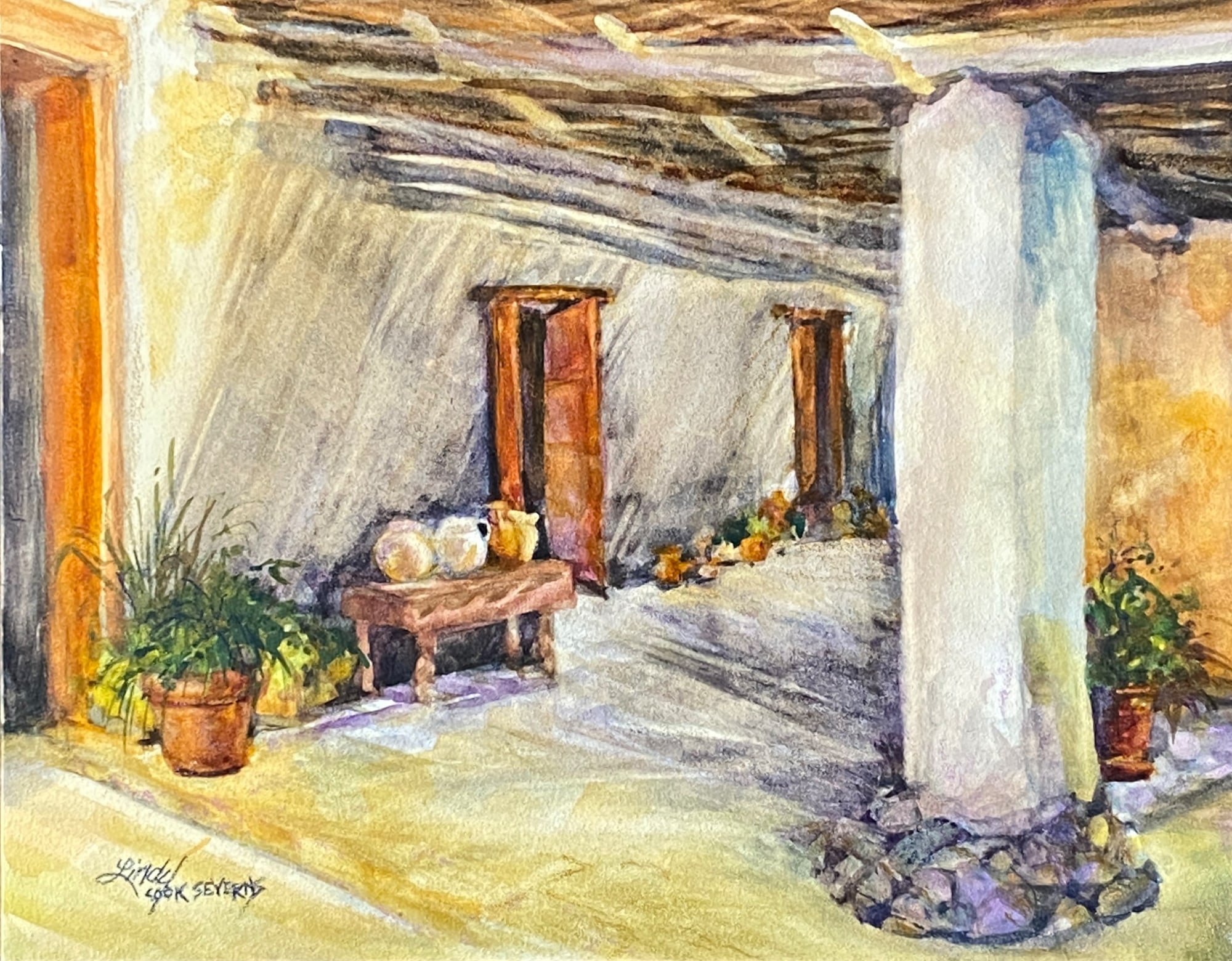 Cibolo Creek Ranch between Marfa and Presidio, now a comfortable resort, was once a borderlands fortress. Ribbons of shade, cool adobe bricks and clay pottery offer a quiet moment on this long patio in the borderlands of Far West Texas.