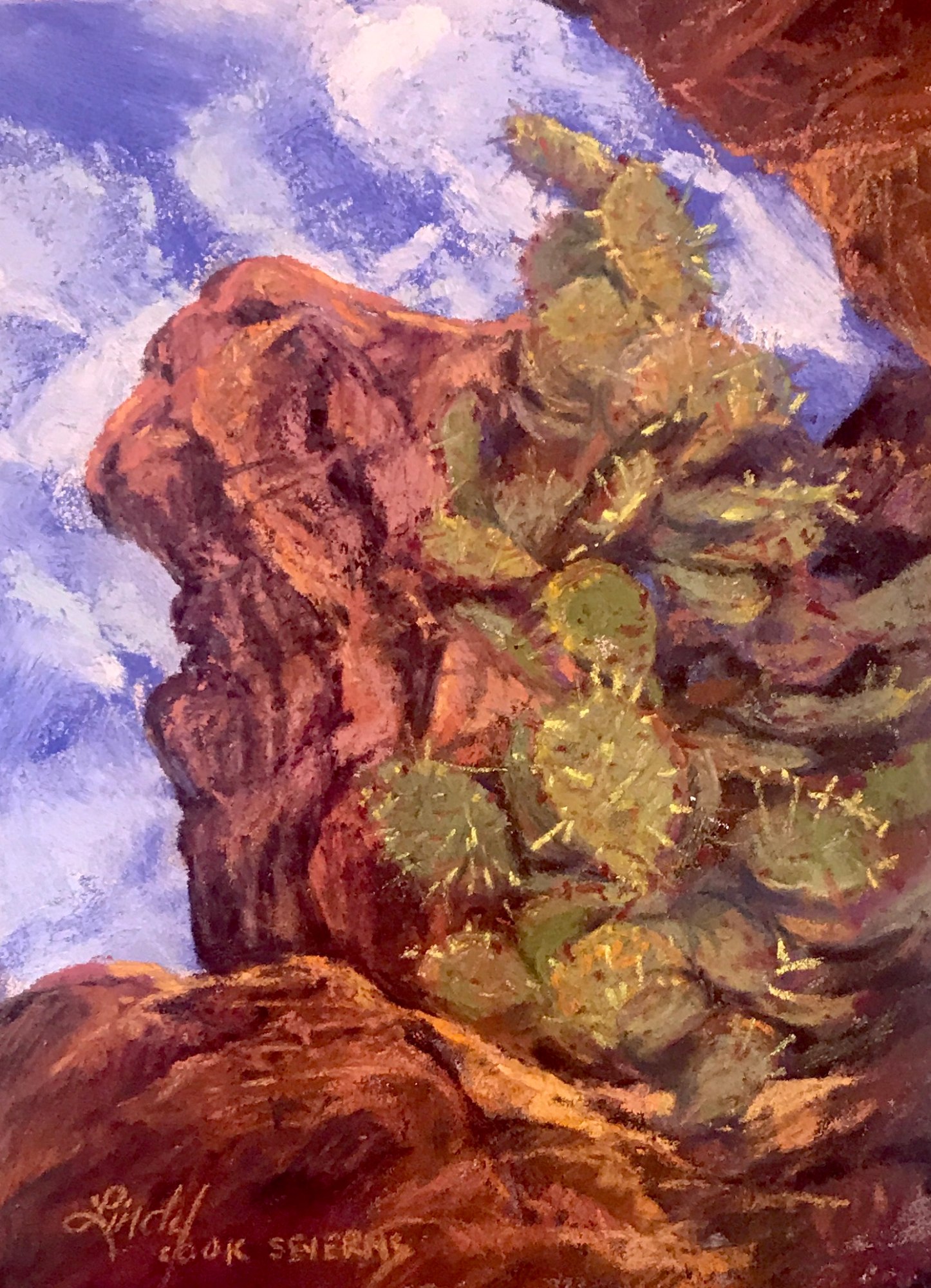 In the desert, anything that rises toward the sky demands attention, like this volcanic boulder and its resident prickly pear cactus. The enterprising prickly pear found enough soil in the rock to sprout and grow, but the cradling bouldersĀ demanded it grow straight up, rather than sprawling all overĀ like a ground-dwelling cactus. It seems to work for both rocks and cactus as they rise dramatically against the shockingly blue sky and those towering cumulus teasing the desert without offering rain.