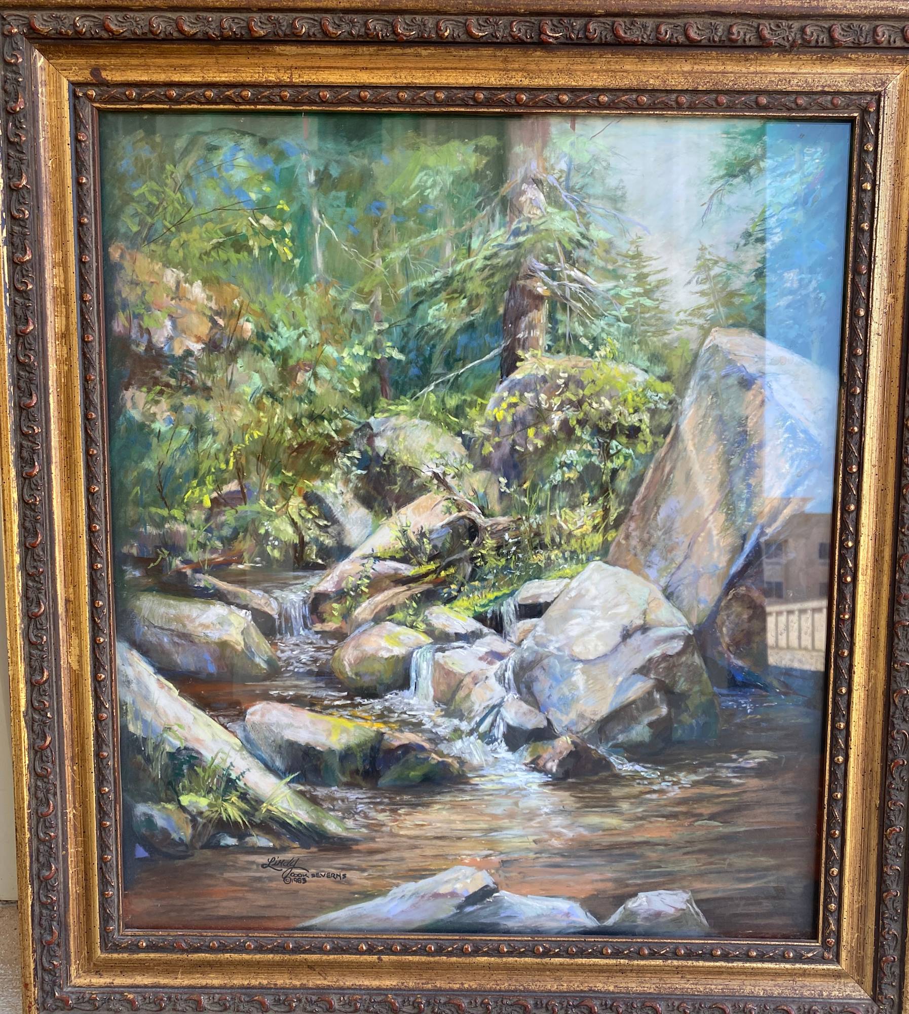This pastel painting was the final piece I did of the same big rock on a mountain stream. Over the years, three generations enjoyed dropping a line in the clear, bubbling water or simply sitting on the rock, soaking in serenity. This 1980's era original is on heavily sanded paper. It's in its original frame, and sealed under clear glass, wired and ready to hang. Never shown, it hung in my grandmother's living room, then in our own home. I learned about painting rocks by doing this series over more than a decade.