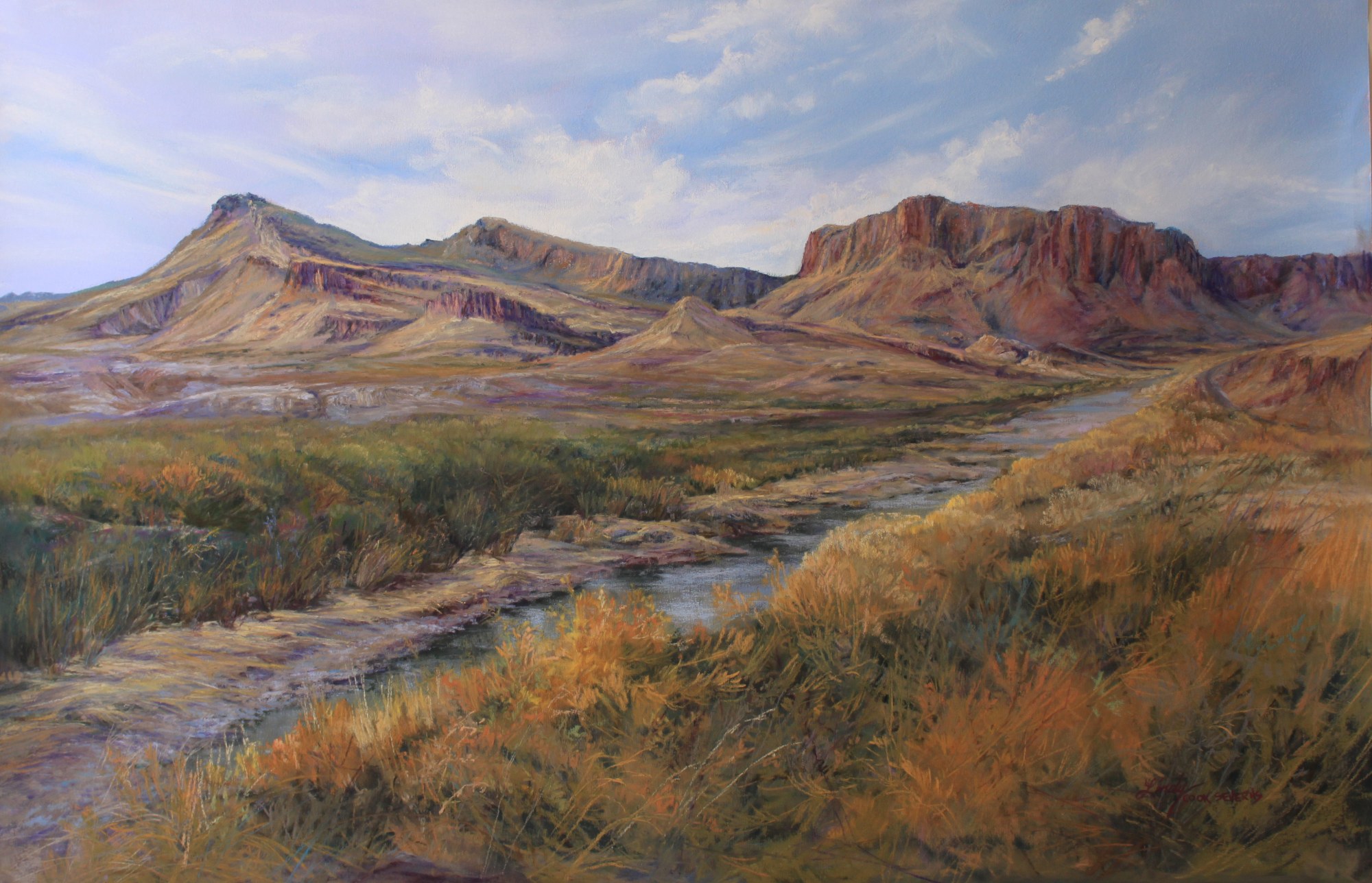 The narrow, winding road along the Rio Grande through Big Bend Ranch State Park from Lajitas to Presidio ranks among the most spectacular drives in North America, and I never tire of driving it, nor, of painting it. In this view of the river, the shadows on the mountains become supporting characters, along with the tall grass and mossy river banks. You can barely make out the small section of relatively insignificant two-lane paved road as it winds along the river as an afterthought to the landscape.