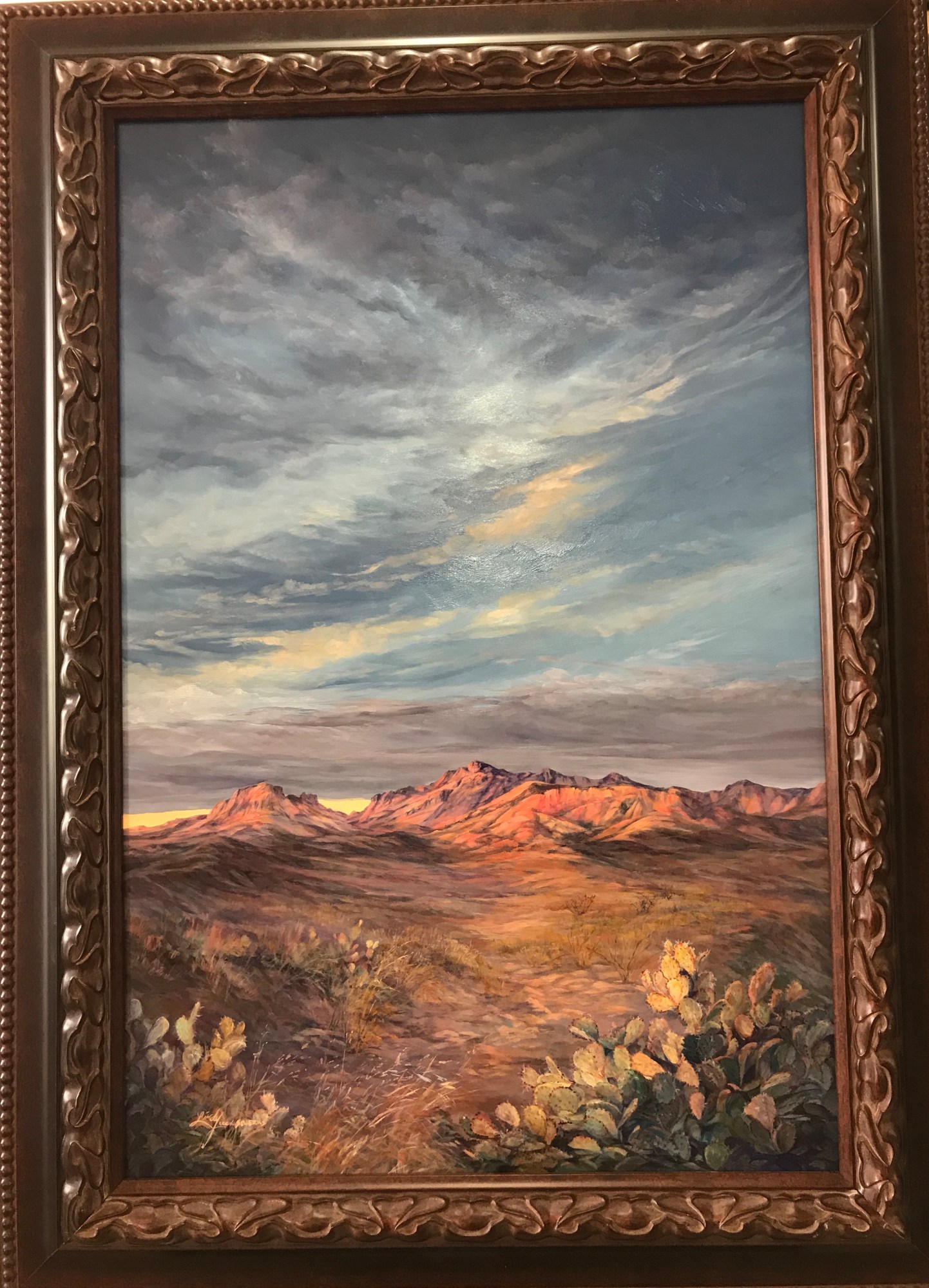 The desert yearns for color, and when the late afternoon sun grants its wish, things turn a little magical. In this sunset desertscape from Big Bend National Park, the sun's glow draws you through translucent prickly pear, across the hardpack and into the Chisos Mountains with a promise of peace. Comfortable silence fills this large canvas, as it fills the desert with peace at day's end.