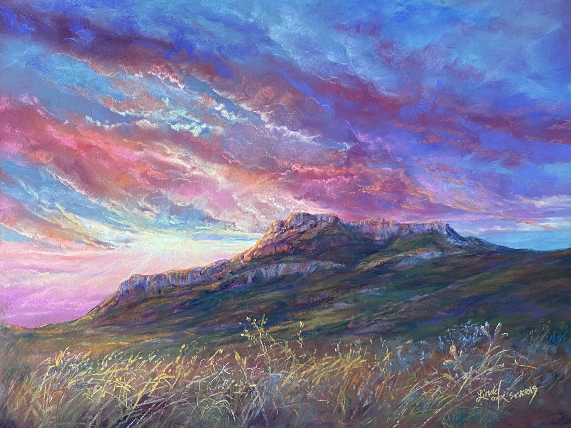 Blue Mountain is a landmark of the high desert near Fort Davis. The mountain rises abruptly from grassland and sprawls across the horizon for miles. Sunset isn't trying to be discrete as it rolls across this ranch country in the Davis Mountains of Far West Texas in a timeless performance.