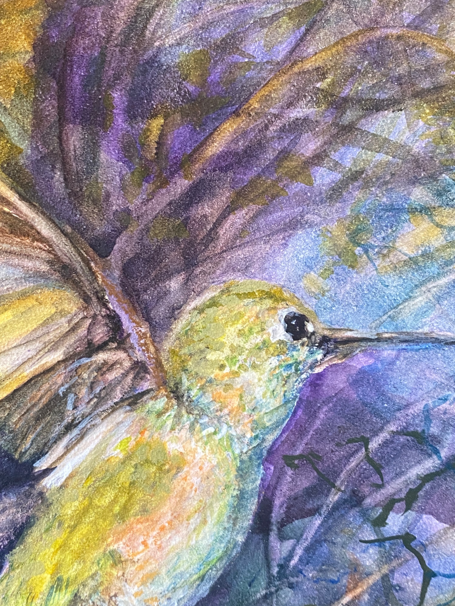 I think they take their day as it comes, spinning, soaring, twirling around the sky until some blossom catches their bright beady eyes, or, like this one, darting in and out of foliage with reckless abandon and a few aerobatic moves to dodge branches. Upon finding himself in a miniature jeweled cavern of pine and brush, he hovered awhile appreciating the magic. He let me take his picture before moving on to his next stop. Where next? I think there's joy in just winging it.