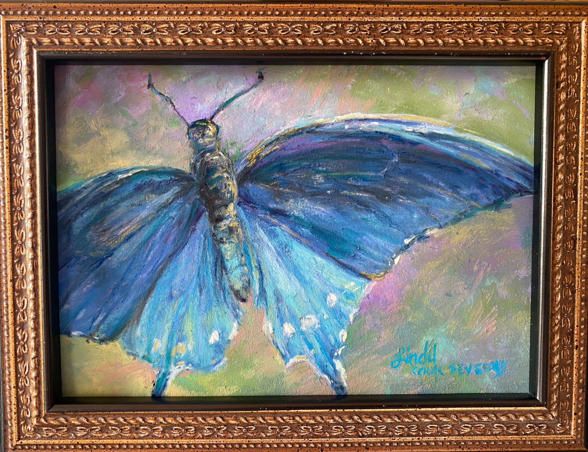 Butterflies, drawn to flowers and water visit the garden in a riot of blues that shimmer against the sky. Butterflies are among the most powerful and beloved icons of summer. Their wings are covered with intricate webs of tiny scales. Fragile to the touch, they are incredibly strong fliers. The "powdery" scales reflect light into a kaleidoscope of iridescent color that makes these winged creatures appear in different colors with each flap of their wings. I think this one is smiling at us, whispering "summer has wings" so enjoy it while it's here.