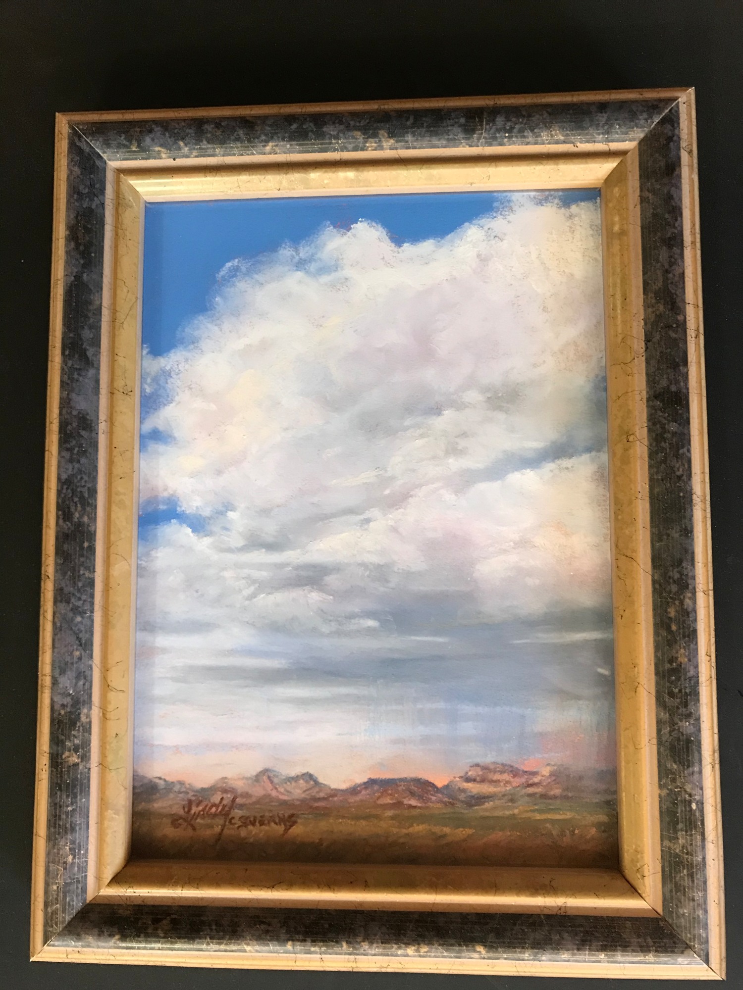 In this miniature skyscape, the towering cloud and thin showers of rain steal the show. The mountains are gently colored beneath the drama of the big West Texas sky. As I painted this rather complex miniature, working the energy of the clouds, I felt it would also fill a larger canvas. So I stopped painting after finishing the sky (most of the painting, actually) to do a larger version of this same skyscape.