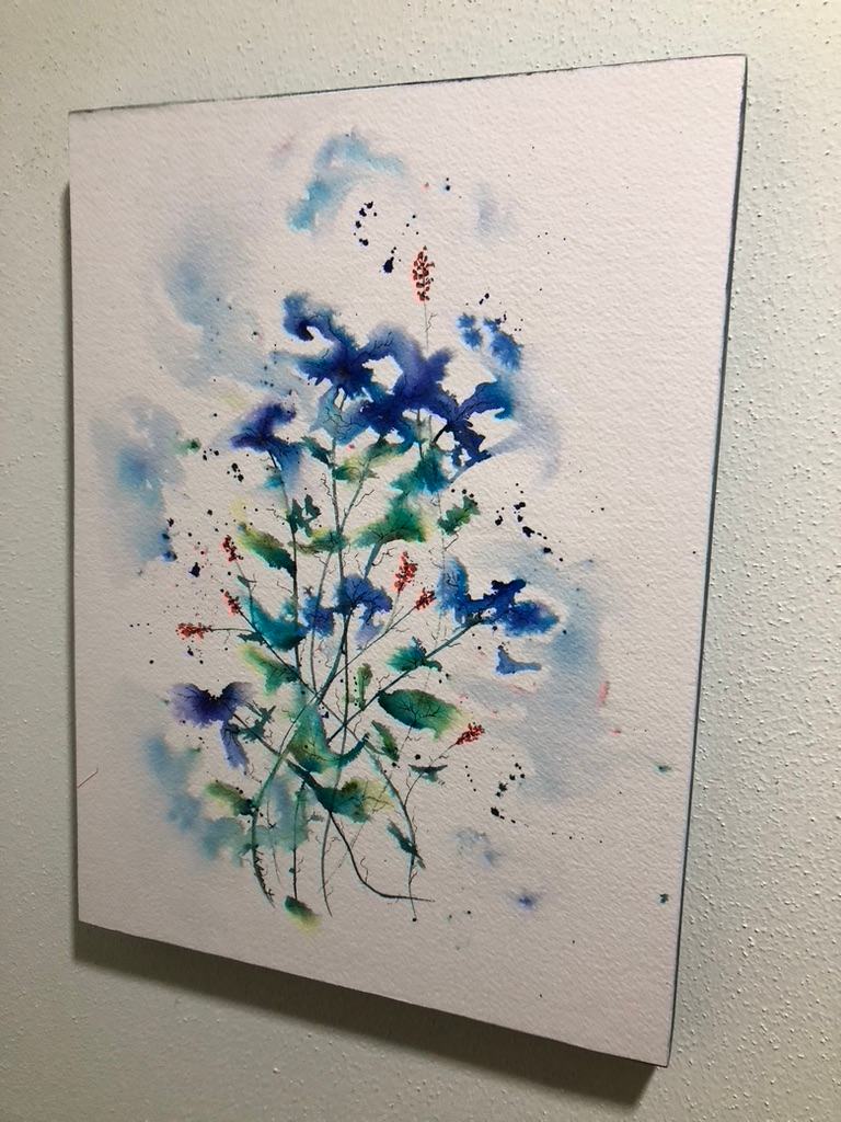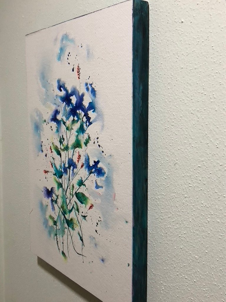 Abstract Blue flowers. Mounted on wooden cradle , ready to hang.