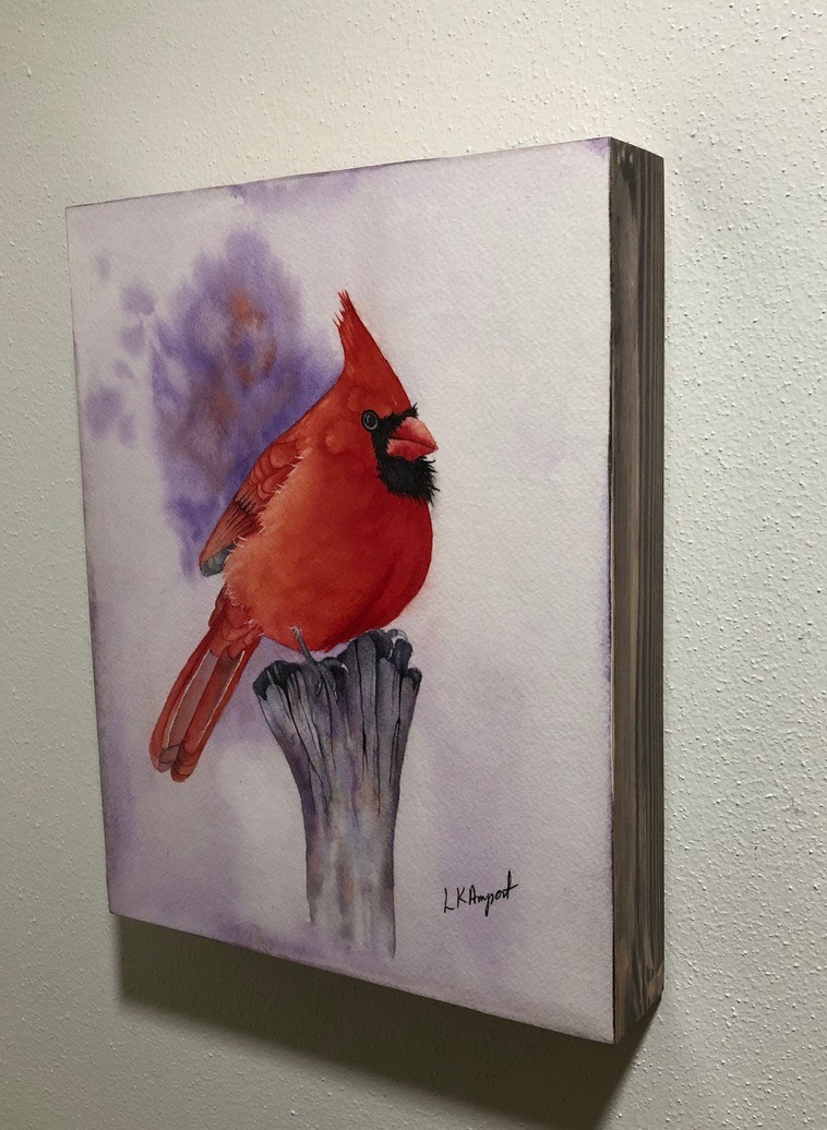 This Watercolor on paper has been coated with a protective varnish. It is bonded onto a 1.5 inch deep wood cradle with the sides tinted lavender/grey, wired on the back and "Ready to Hang".